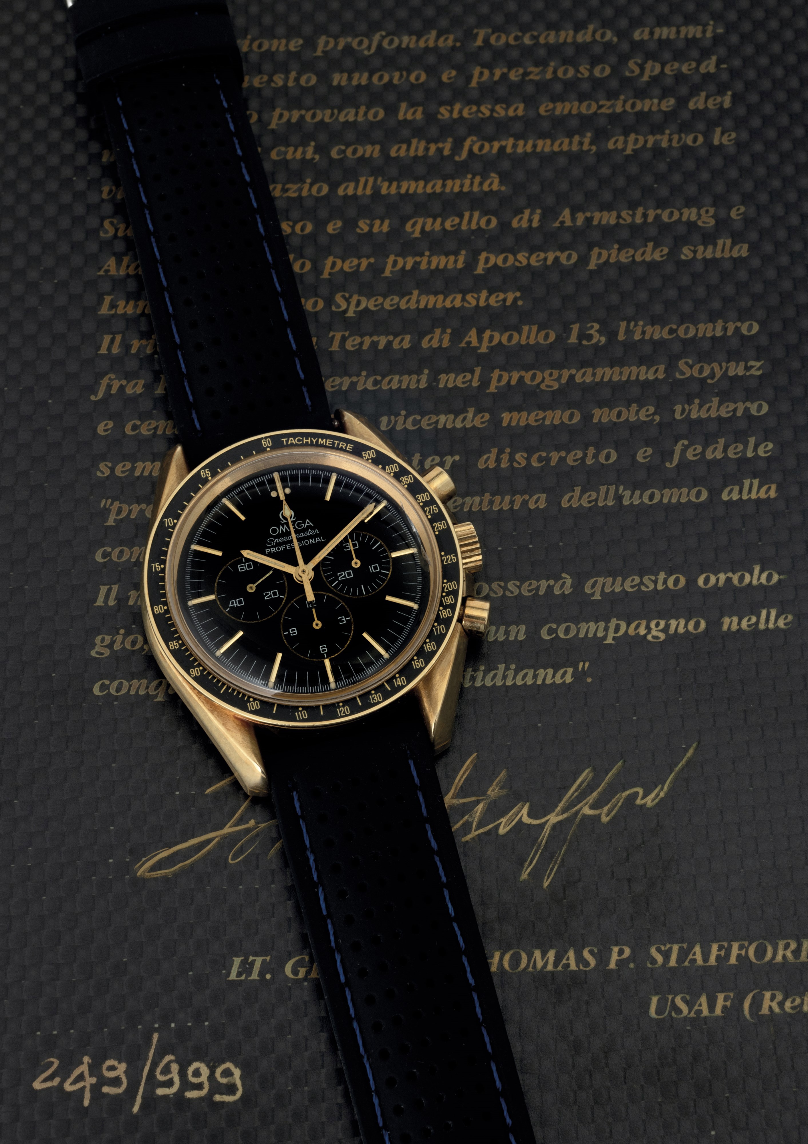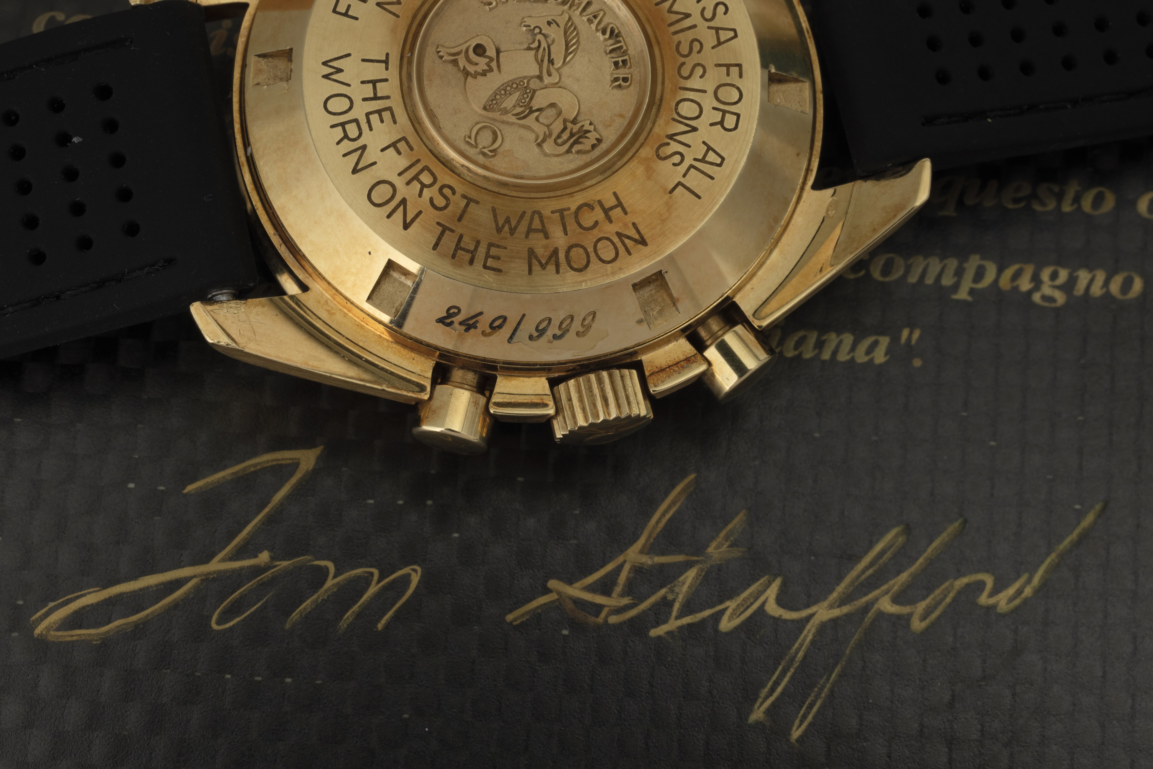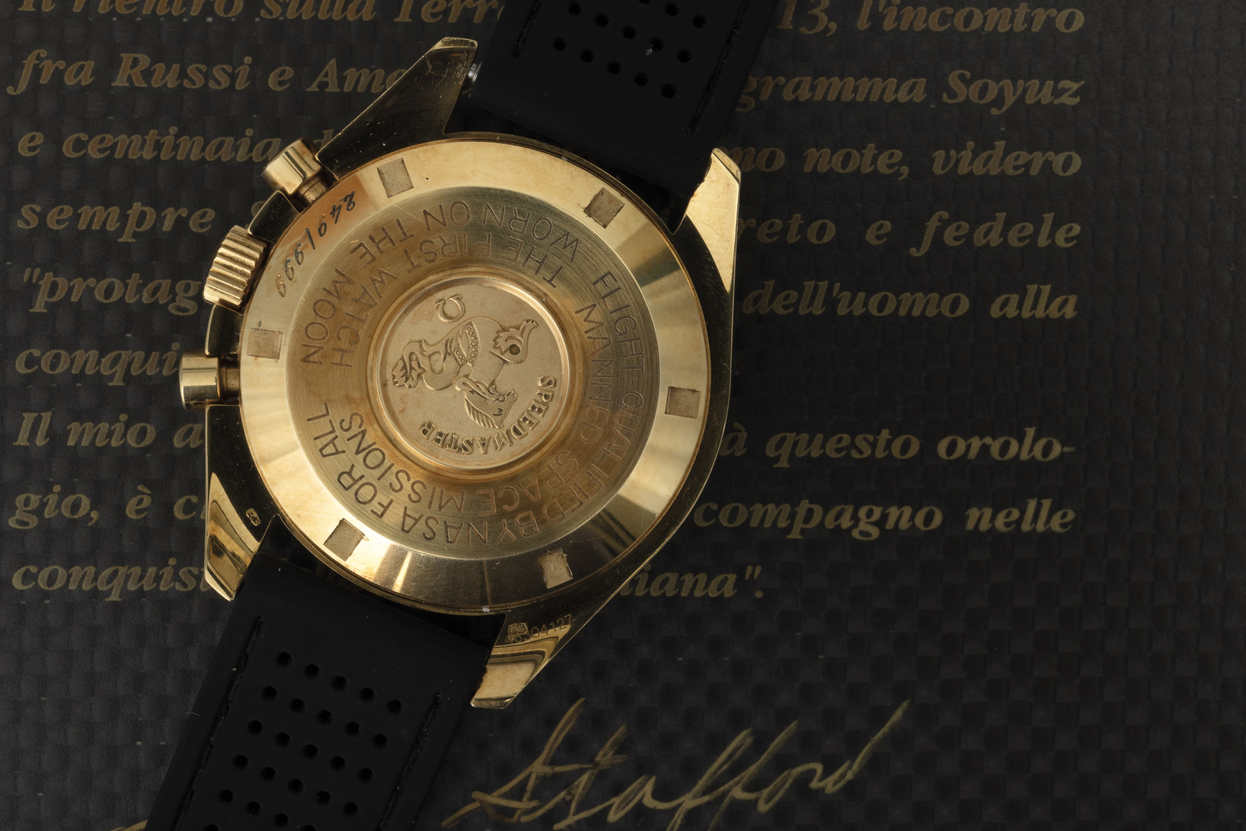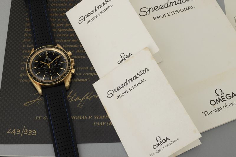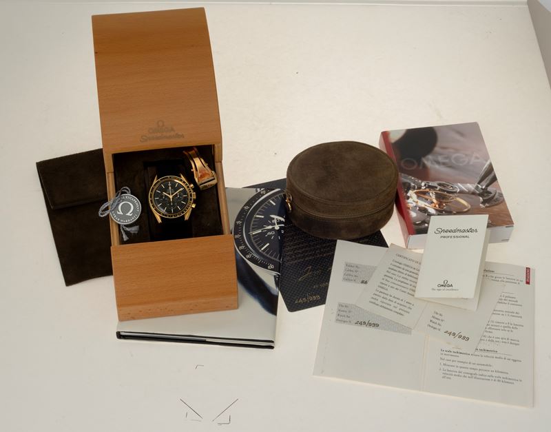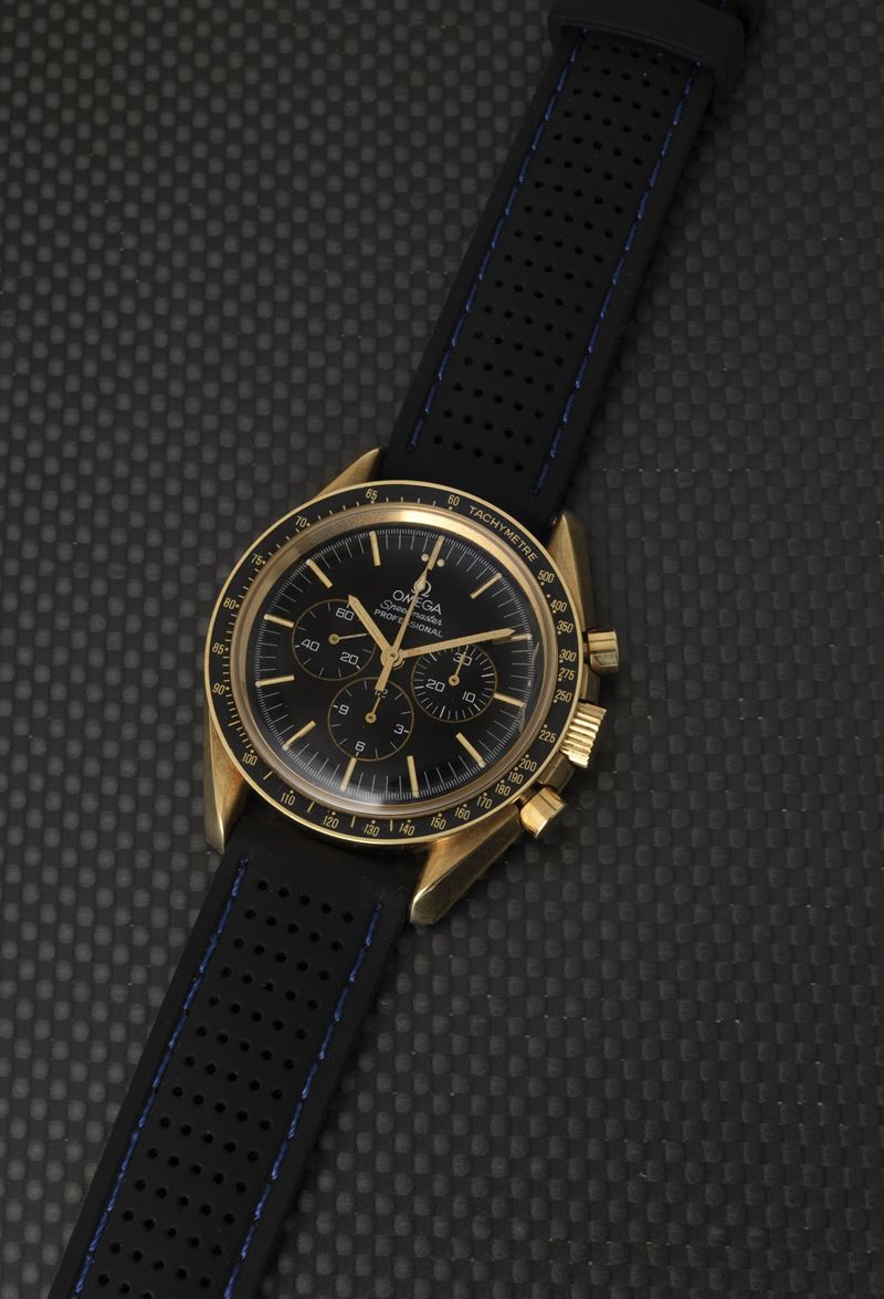In 1942 the first Omega chronographs equipped with the caliber 27 CHRO C12 were marketed, which later evolved and was later renamed caliber 321. As such it equipped several models, including all Speedmasters until 1968. Fifty years on, this 1992 limited edition pays tribute to it. The model, produced in 999 pieces, features a yellow gold case, caliber 863 and, for the first time in a Speedmaster, sapphire crystal. It came in a special wooden case. (Credit: Moonwatch Only, A. Marquié)