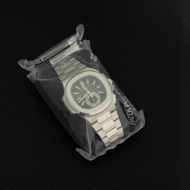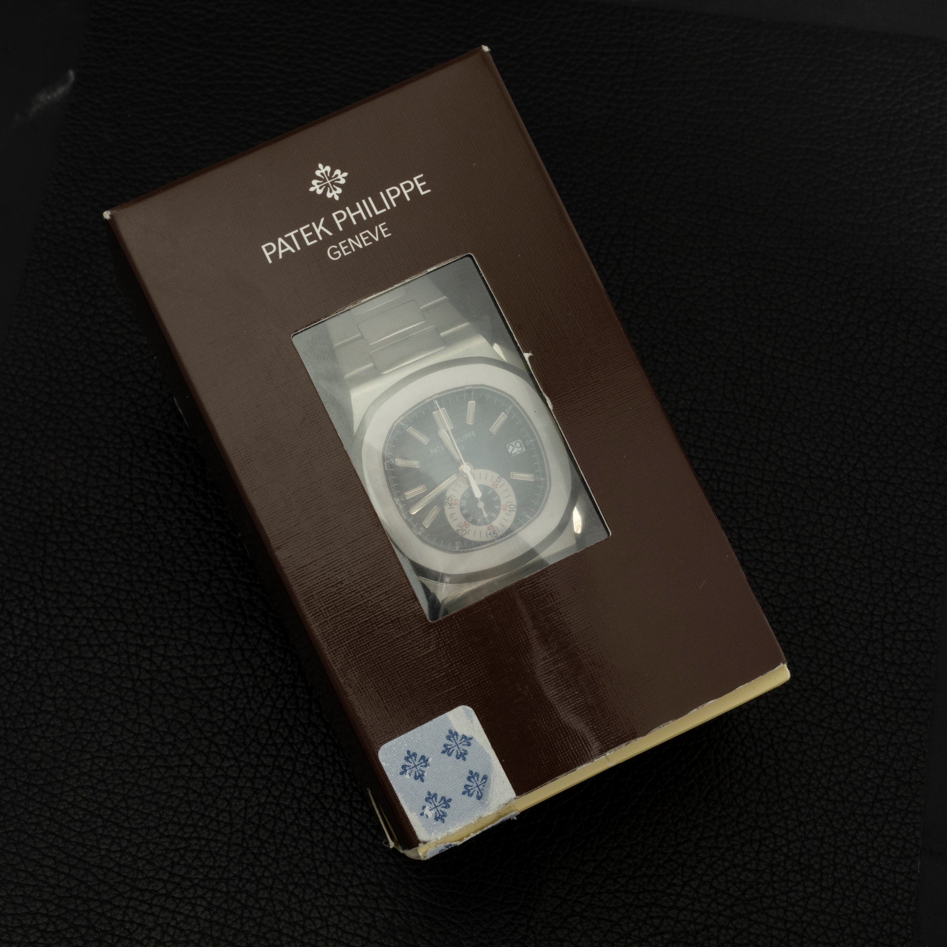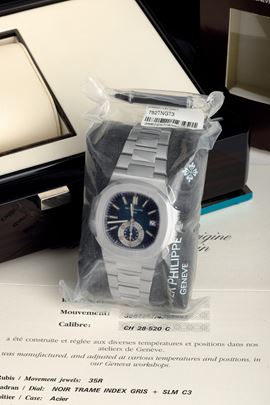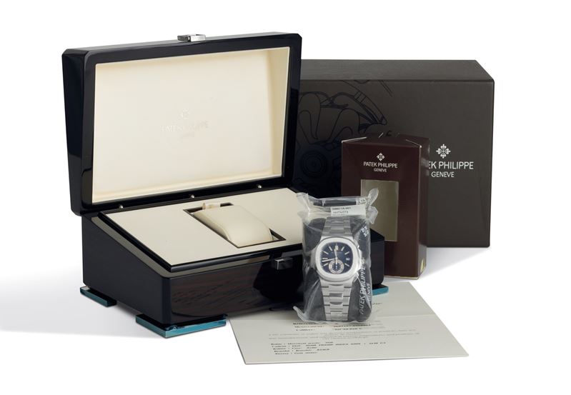 Introduced in 2006, the reference 5980/1 was launched together with its sister timepiece reference 5711. The same year the entire Nautilus celebrated its 30th anniversary. At the time of launch, it was a completely new design, as the Nautilus model had never incorporated a chronograph function. Equipped with the caliber CH 28-250, the self-winding manufacture chronograph.Released from production in 2014, the reference 5980 is one of the best modern sports watches in its class, the present watch is preserved in its only sealed condition. Never exposed to any use, the watch offered is complete with all accessories suitable for discerning collectors. The present lot represents an important milestone for the entire Nautilus collection, the reference 5980 is now an icon for a generation of collectors of this Maison.