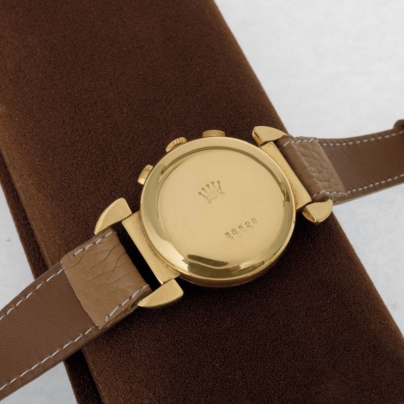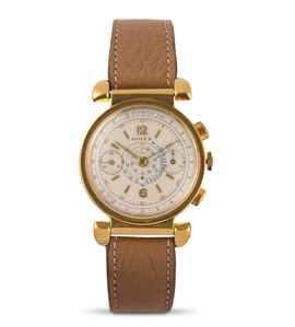 Antimagnetic chronograph ref 3082 in 18k yellow gold with jointed lugs and olive keys, two counters and snailed tachymeter scale
