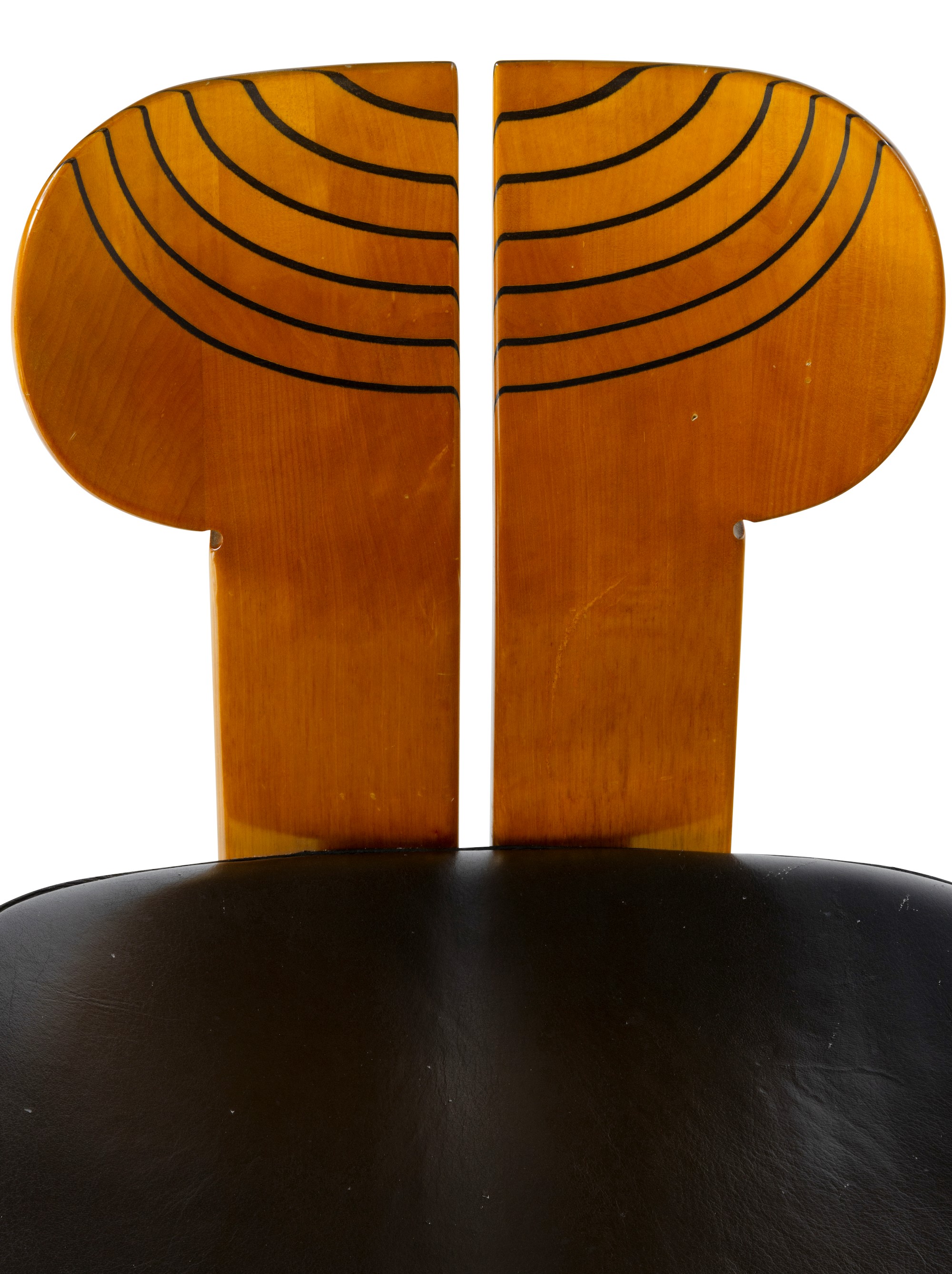 Struttura in legno e sedile in compensato curvato rivestito in pelle.