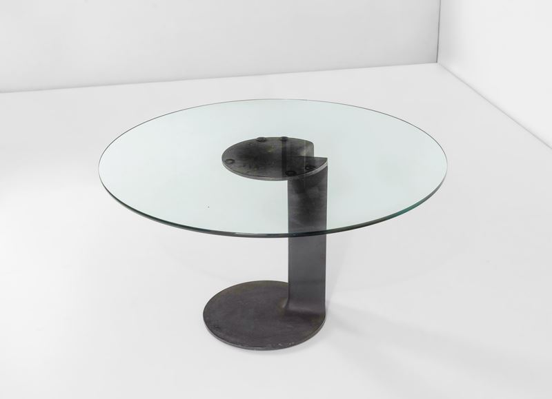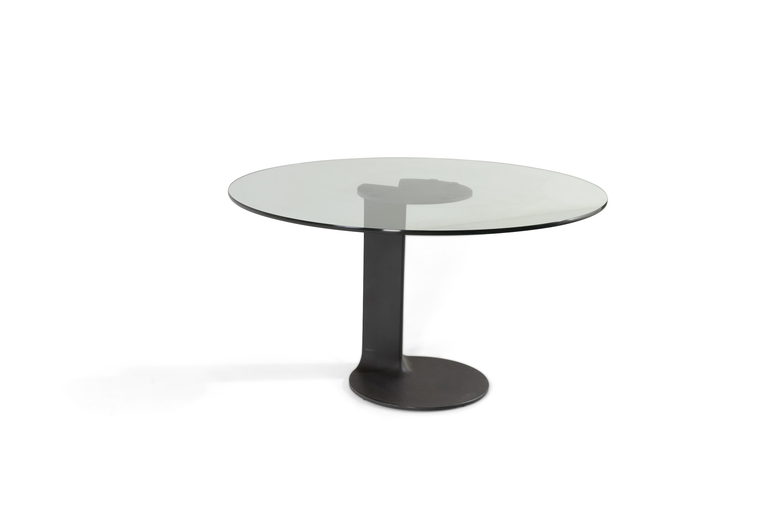 Struttura in fusione di alluminio brunito e piano circolare in cristallo molato.
