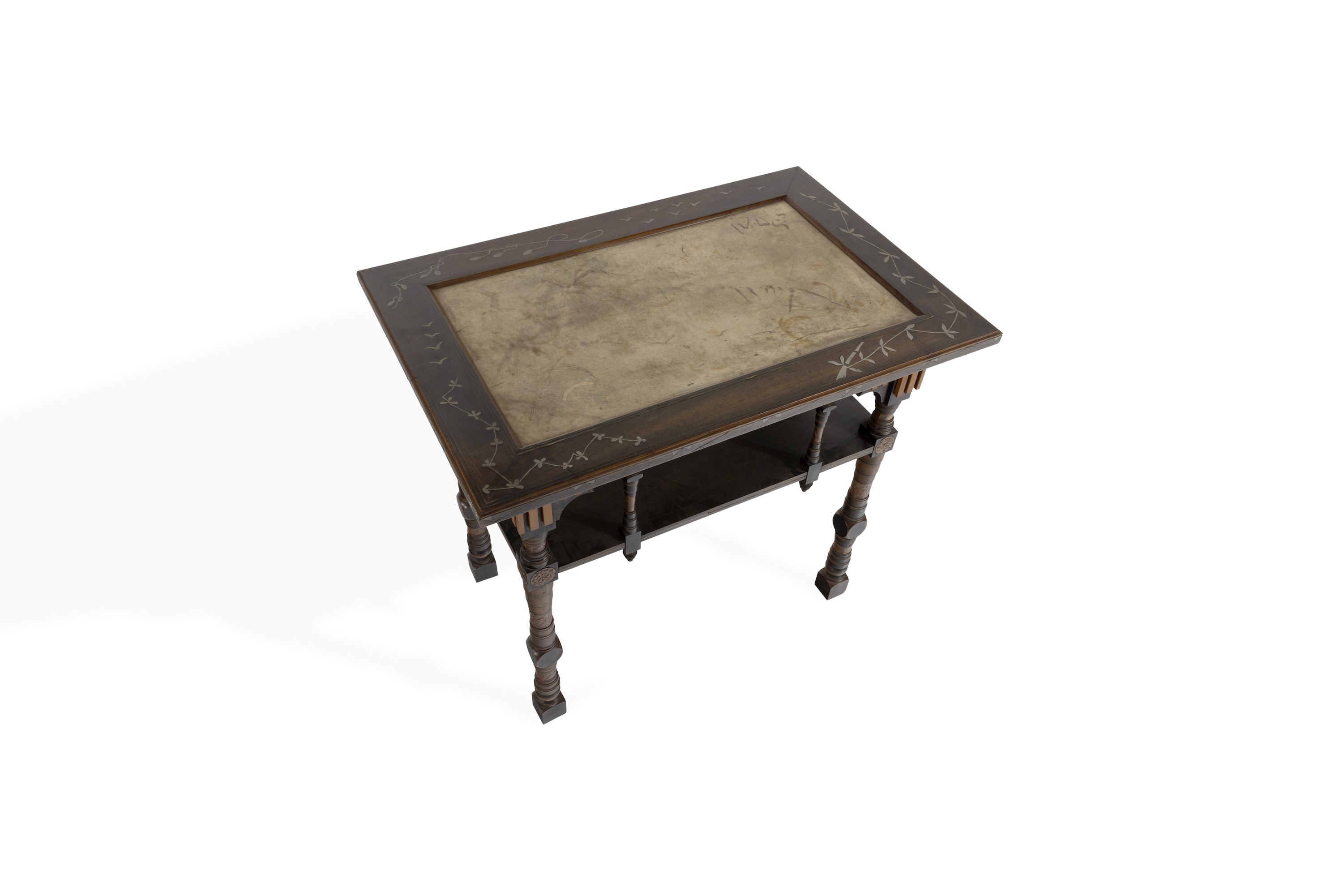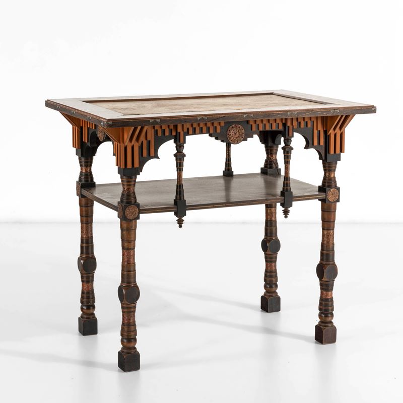 Struttura in legno ebanizzato, rivestimenti in pergamena decorata. Dettagli in peltro e rame sbalzato.