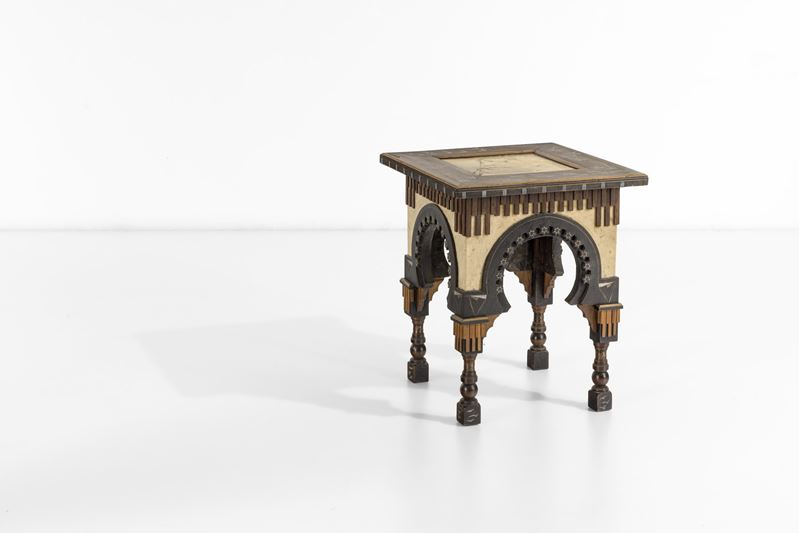 Struttura in legno ebanizzato, rivestimenti in pergamena decorata. Dettagli in peltro e rame sbalzato.