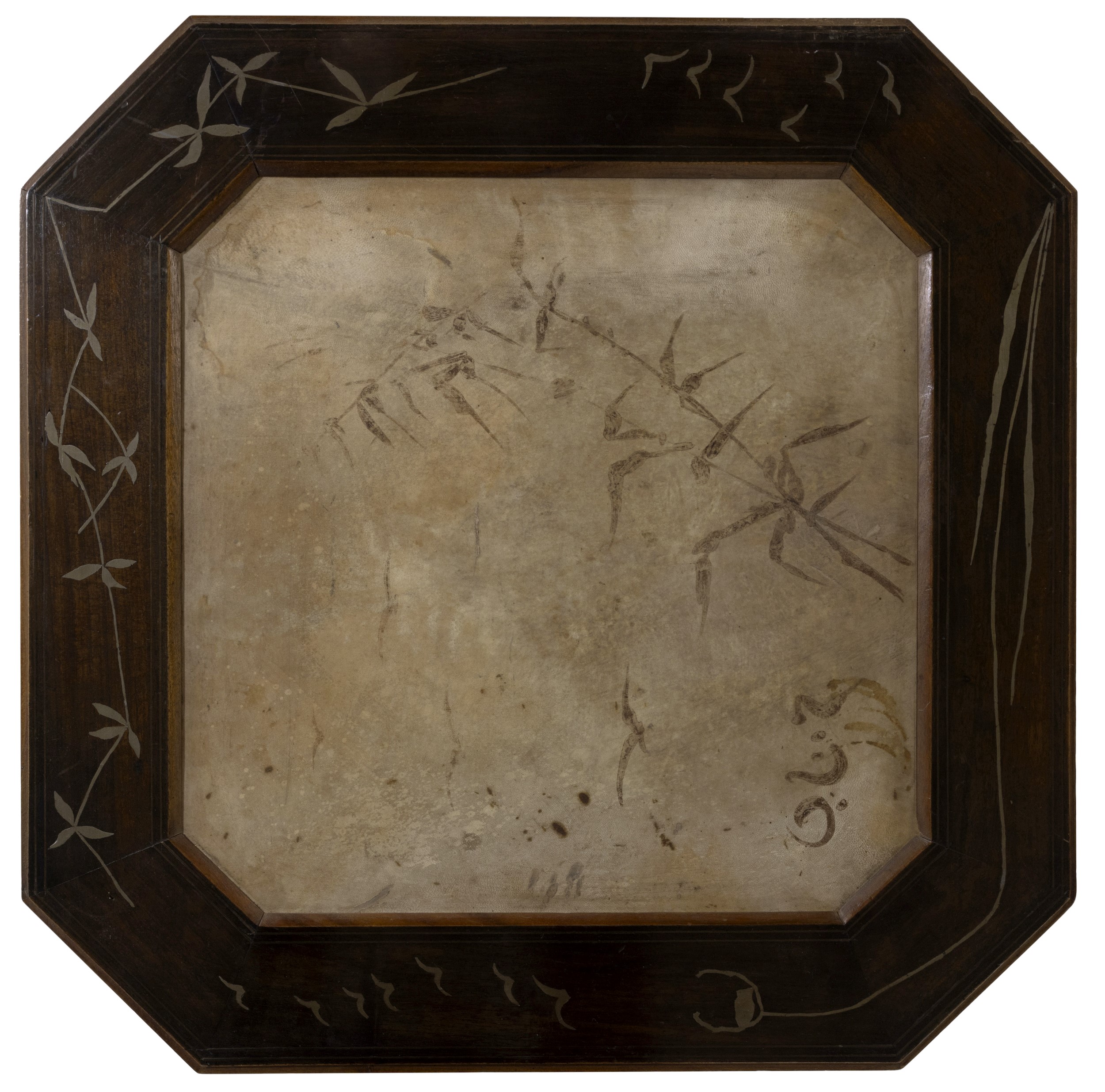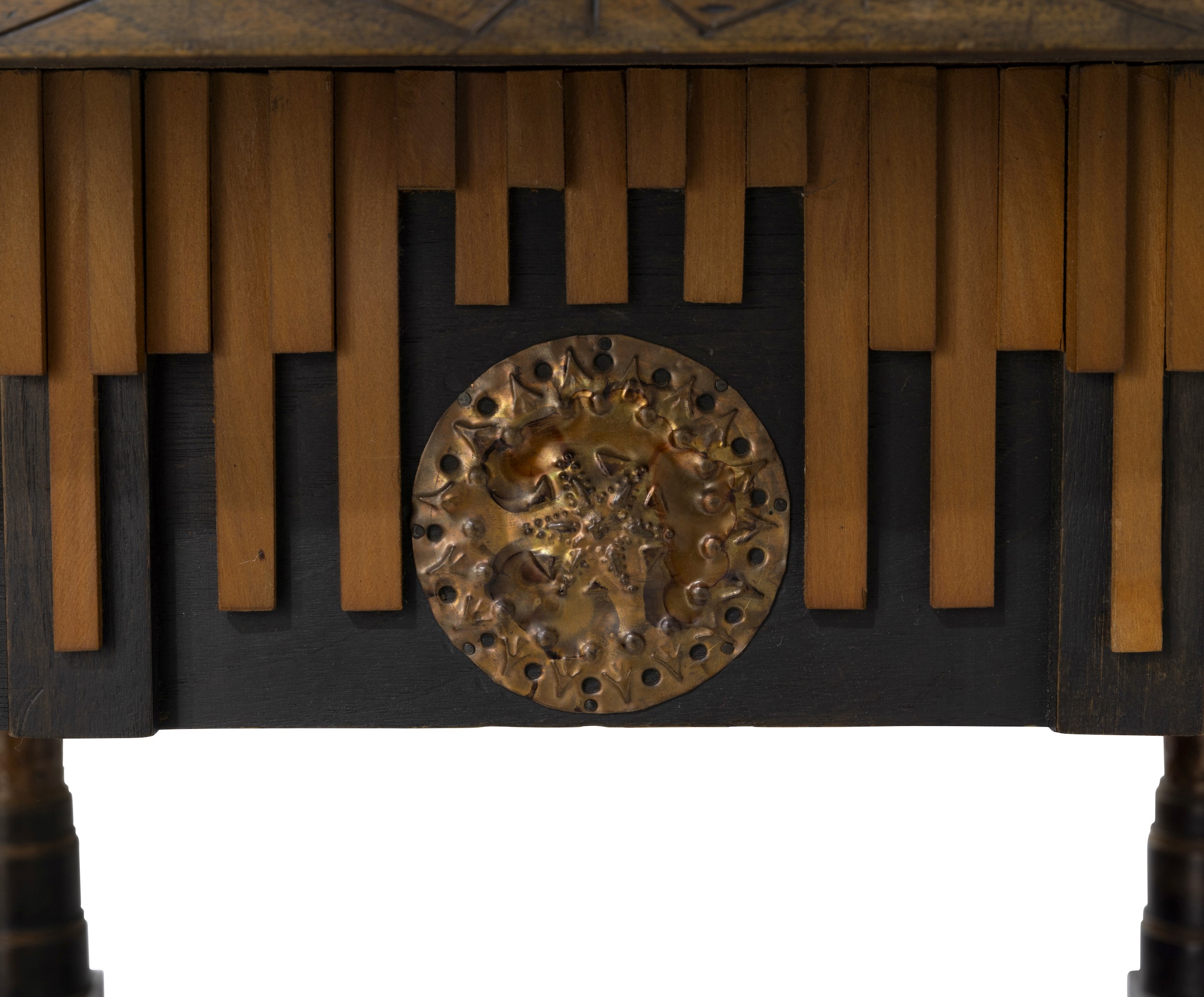 Struttura in legno ebanizzato, rivestimenti in pergamena decorata. Dettagli in peltro, rame sbalzato e passamaneria.