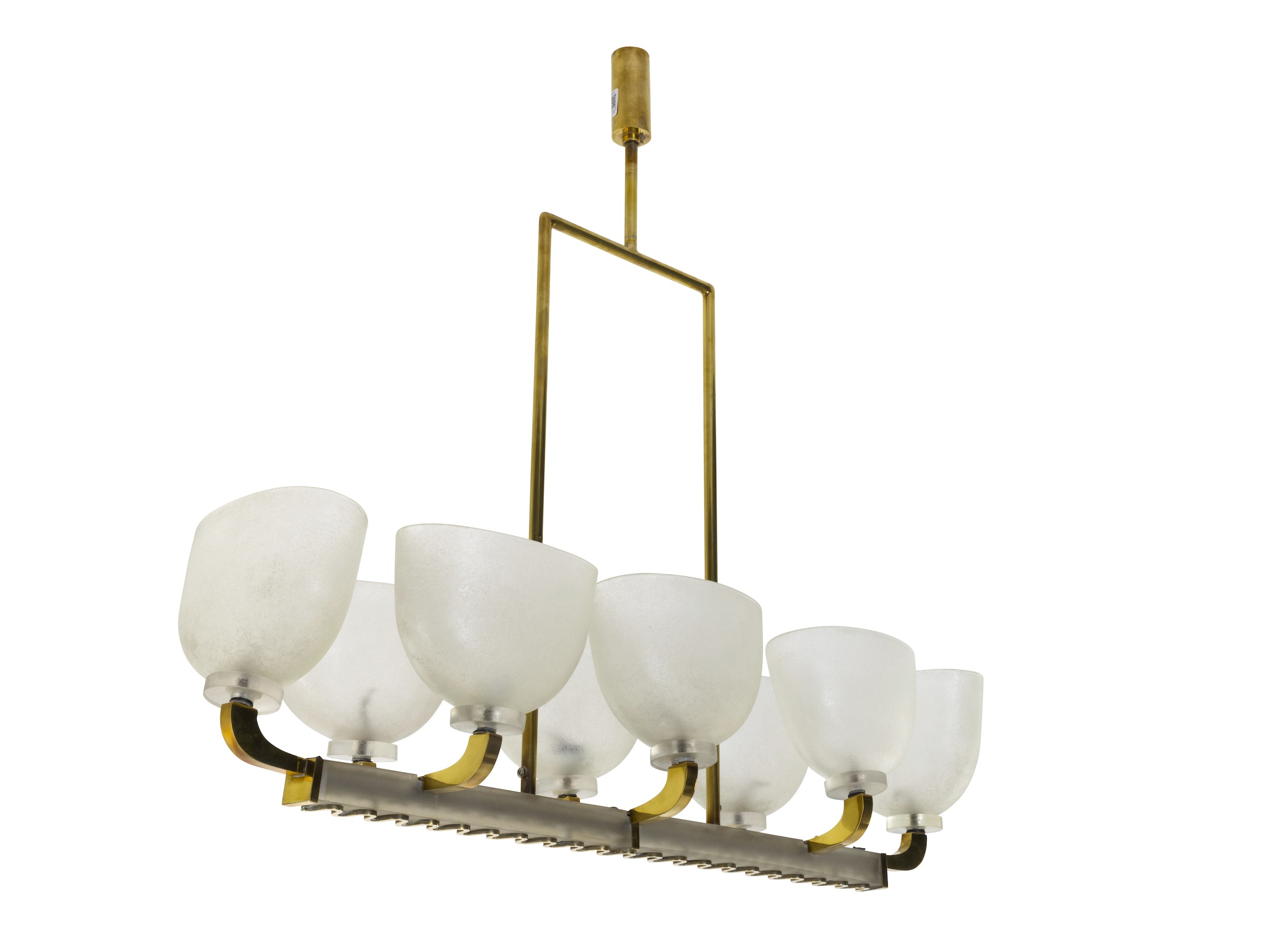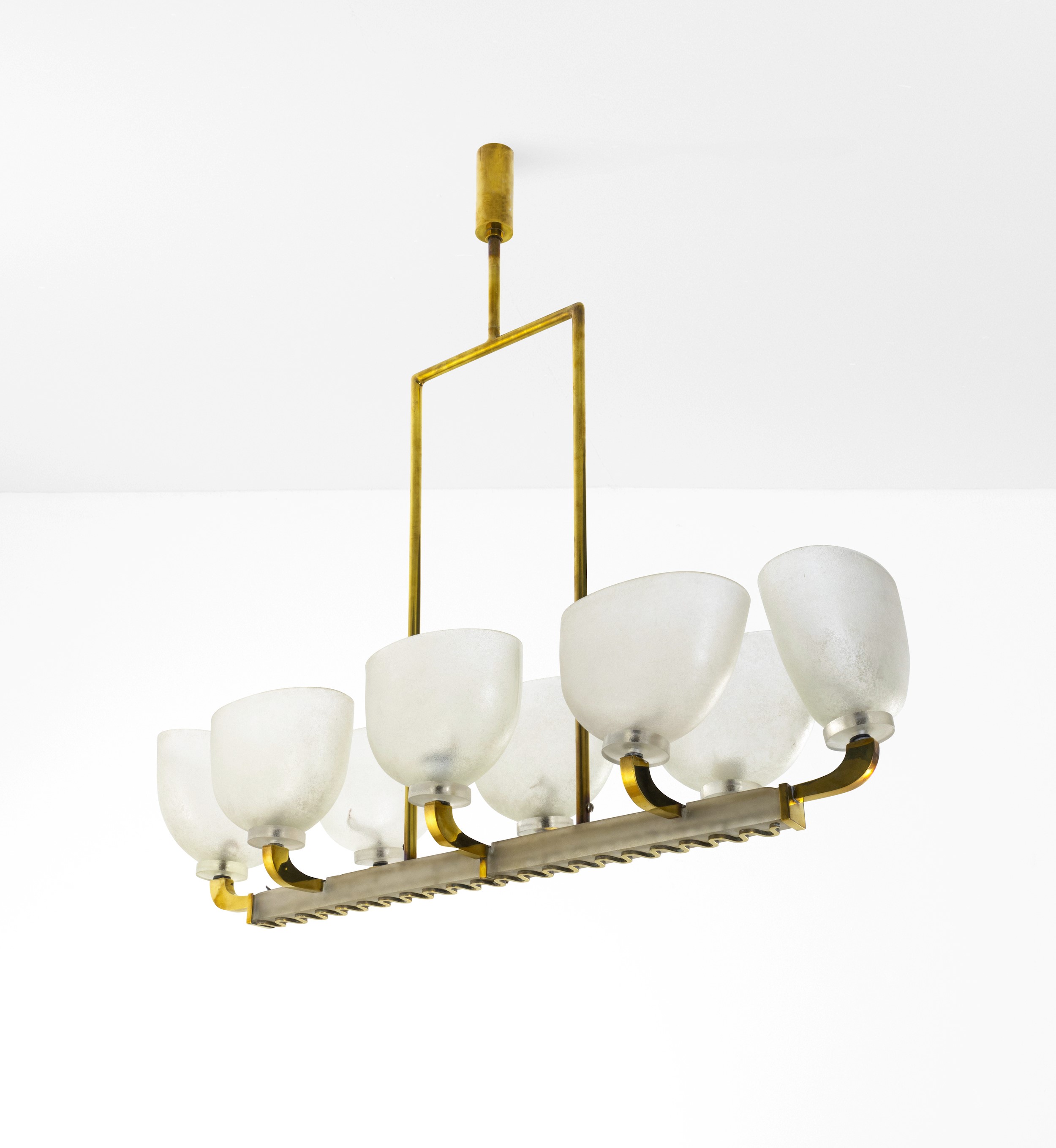 Struttura in ottone e diffusori in vetro di Murano pulegoso e corroso.