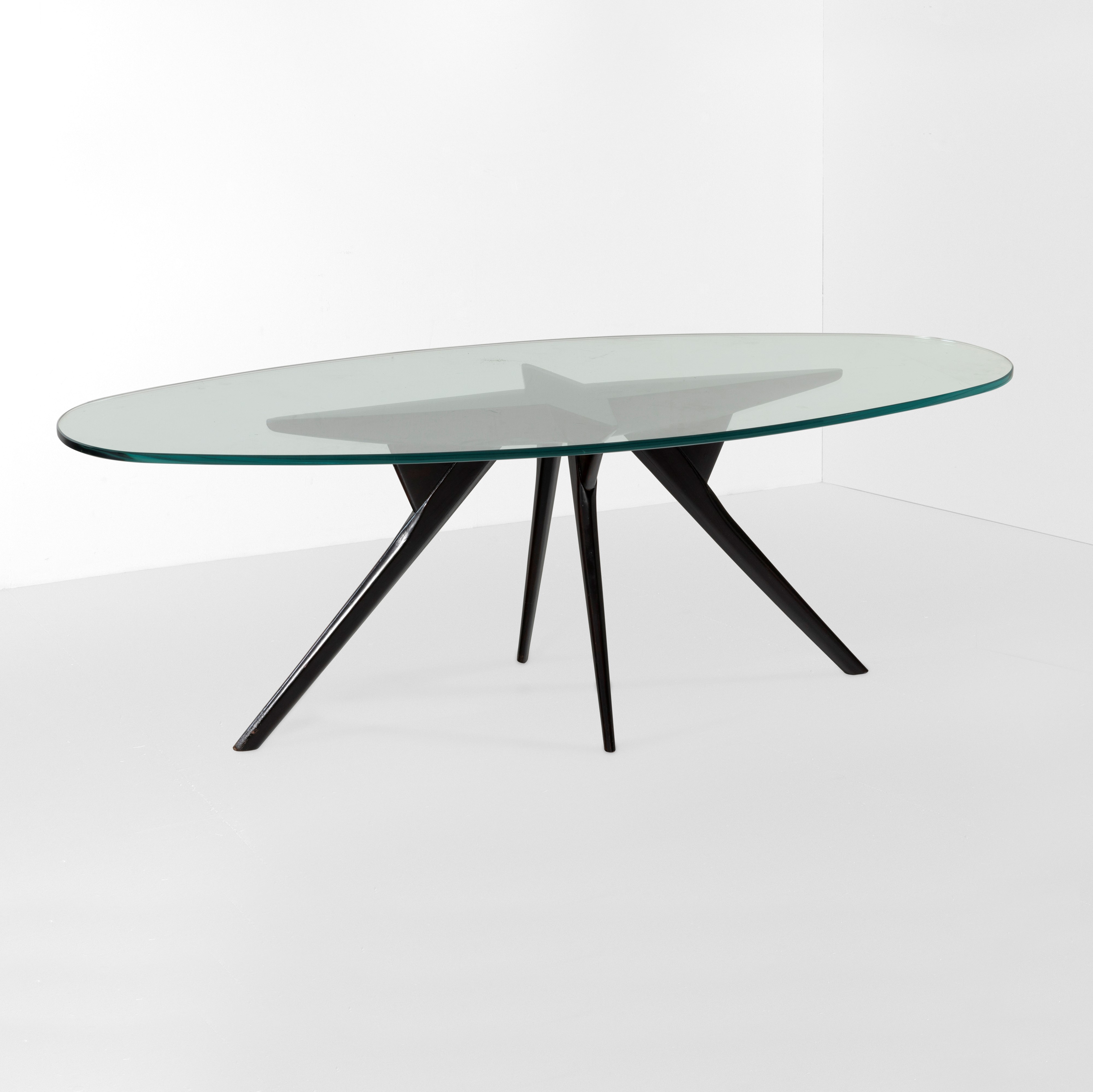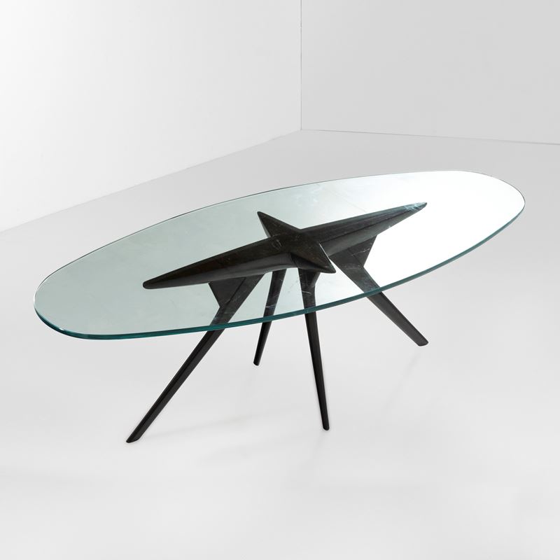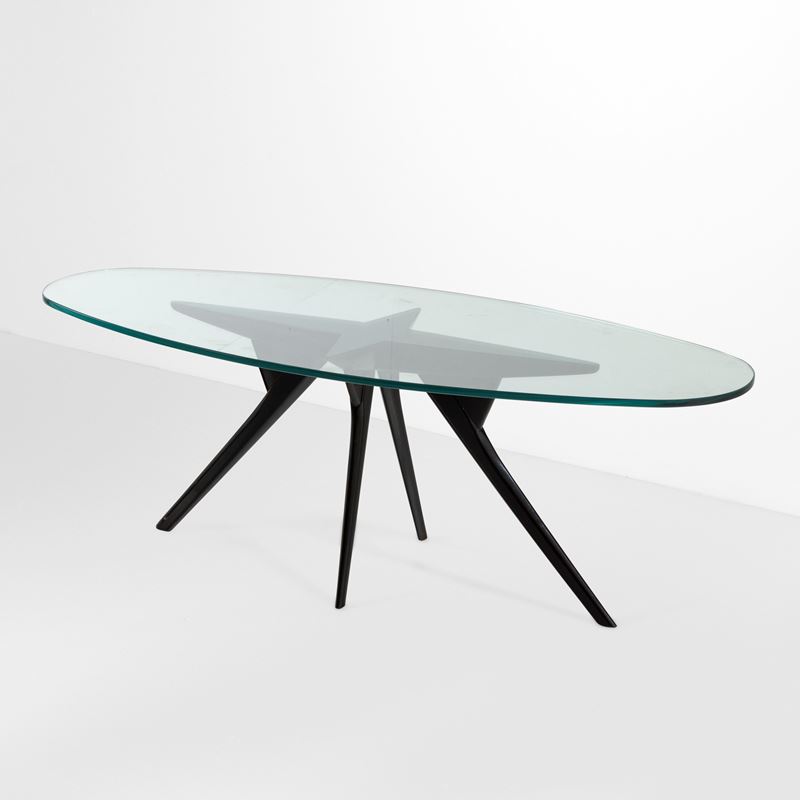 Struttura in legno ebanizzato e legno impiallacciato, piano in cristallo molato di forte spessore.