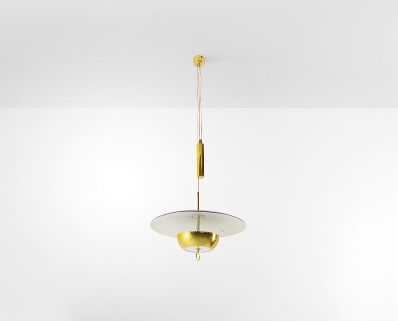 Struttura in ottone e diffusore in metallo laccato, ottone e perspex.