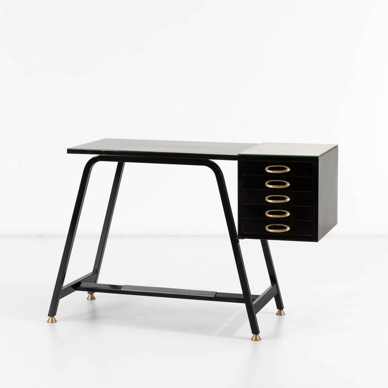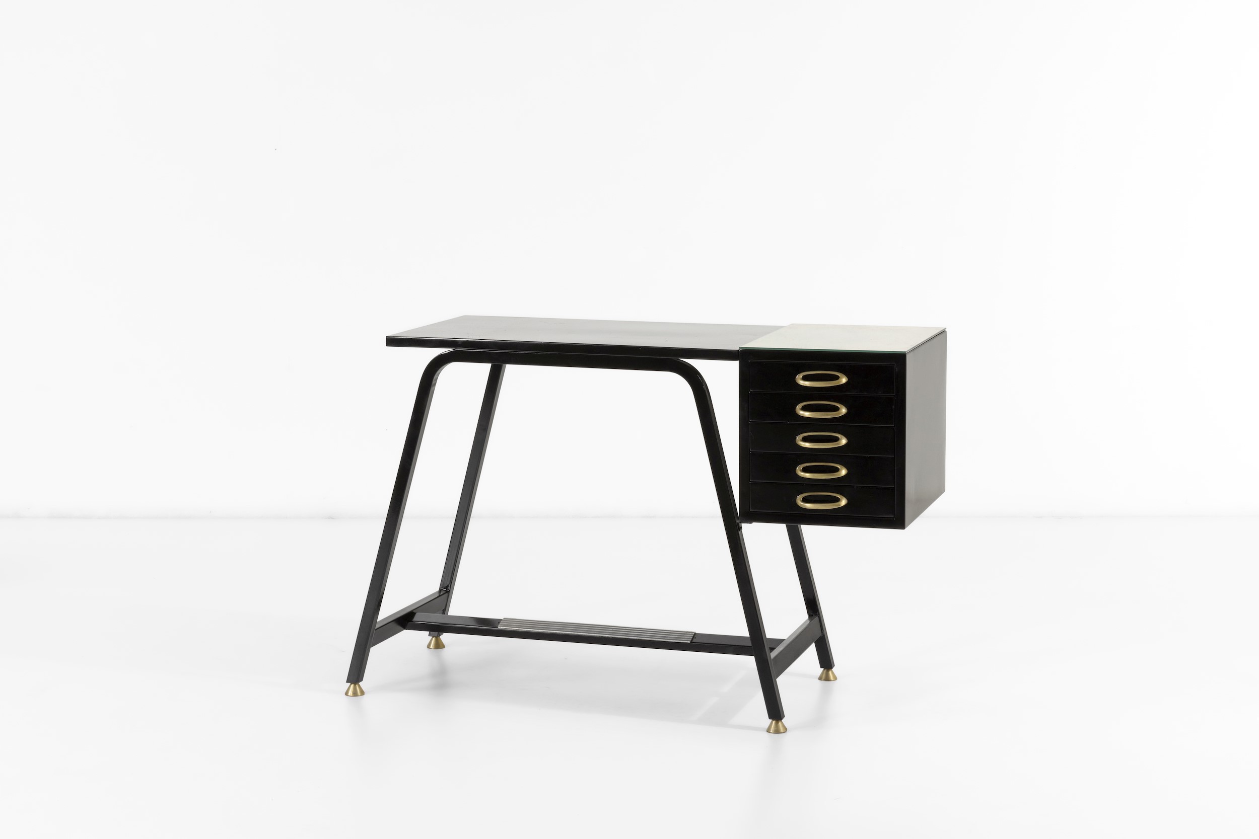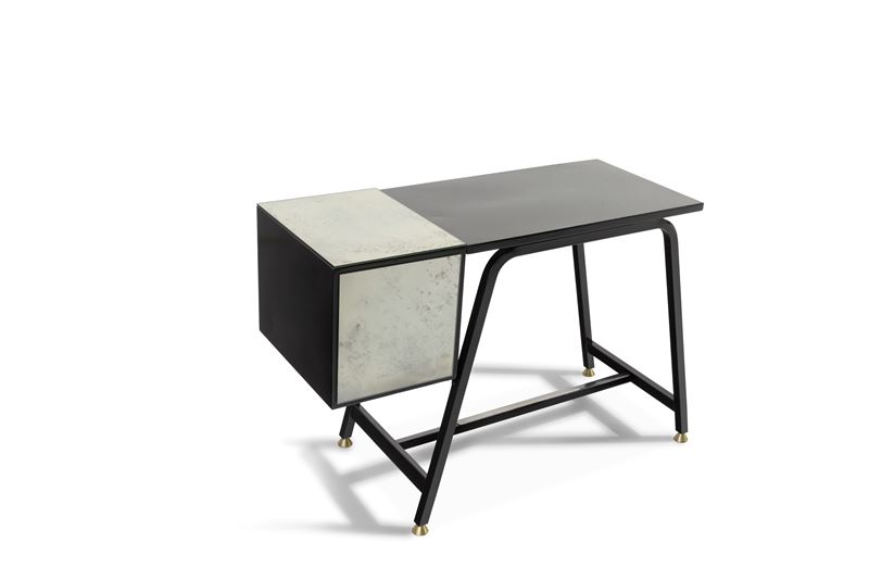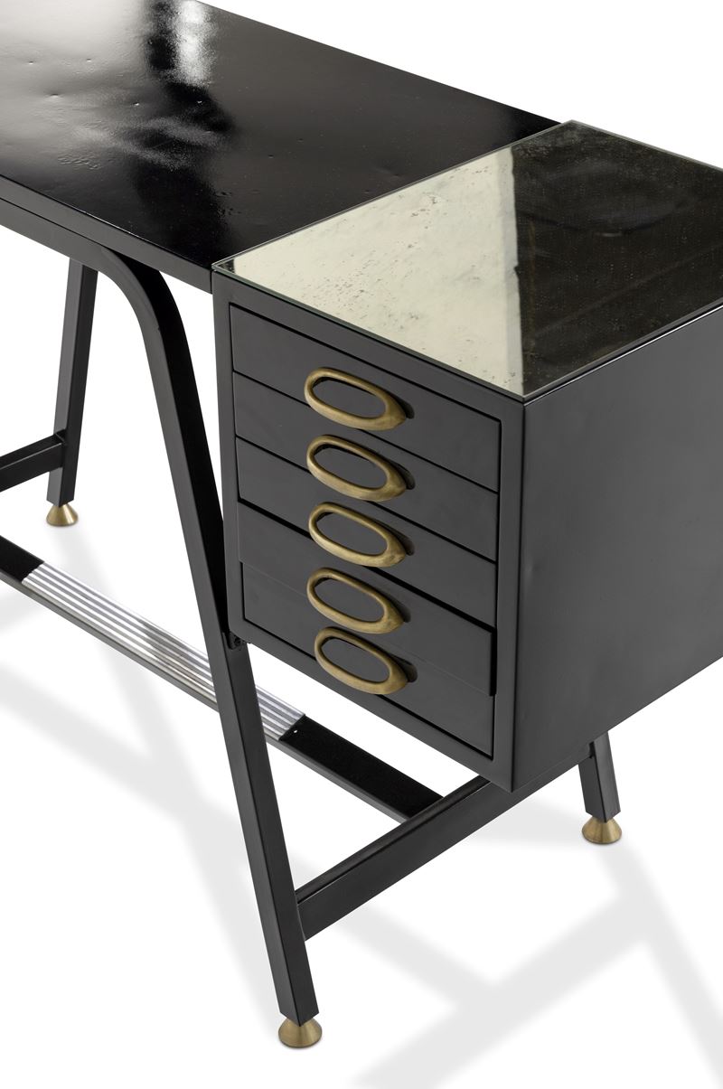 Metallo laccato, maniglie e puntali in ottone e piano in cristallo specchiato.
