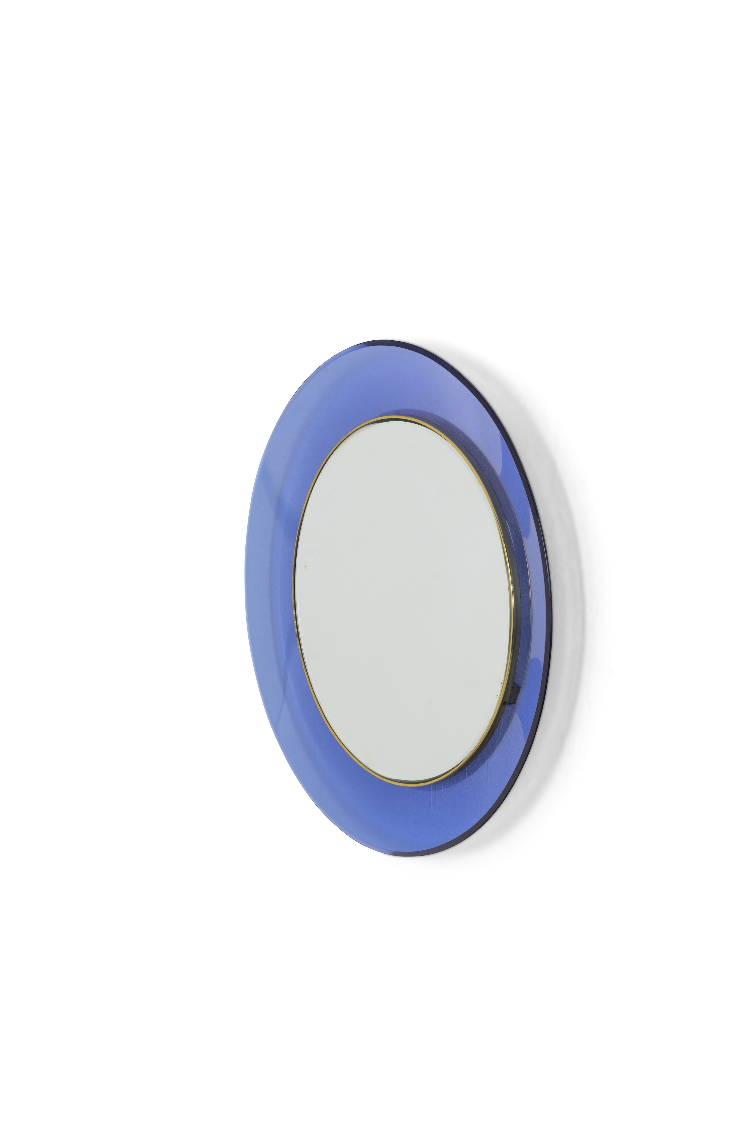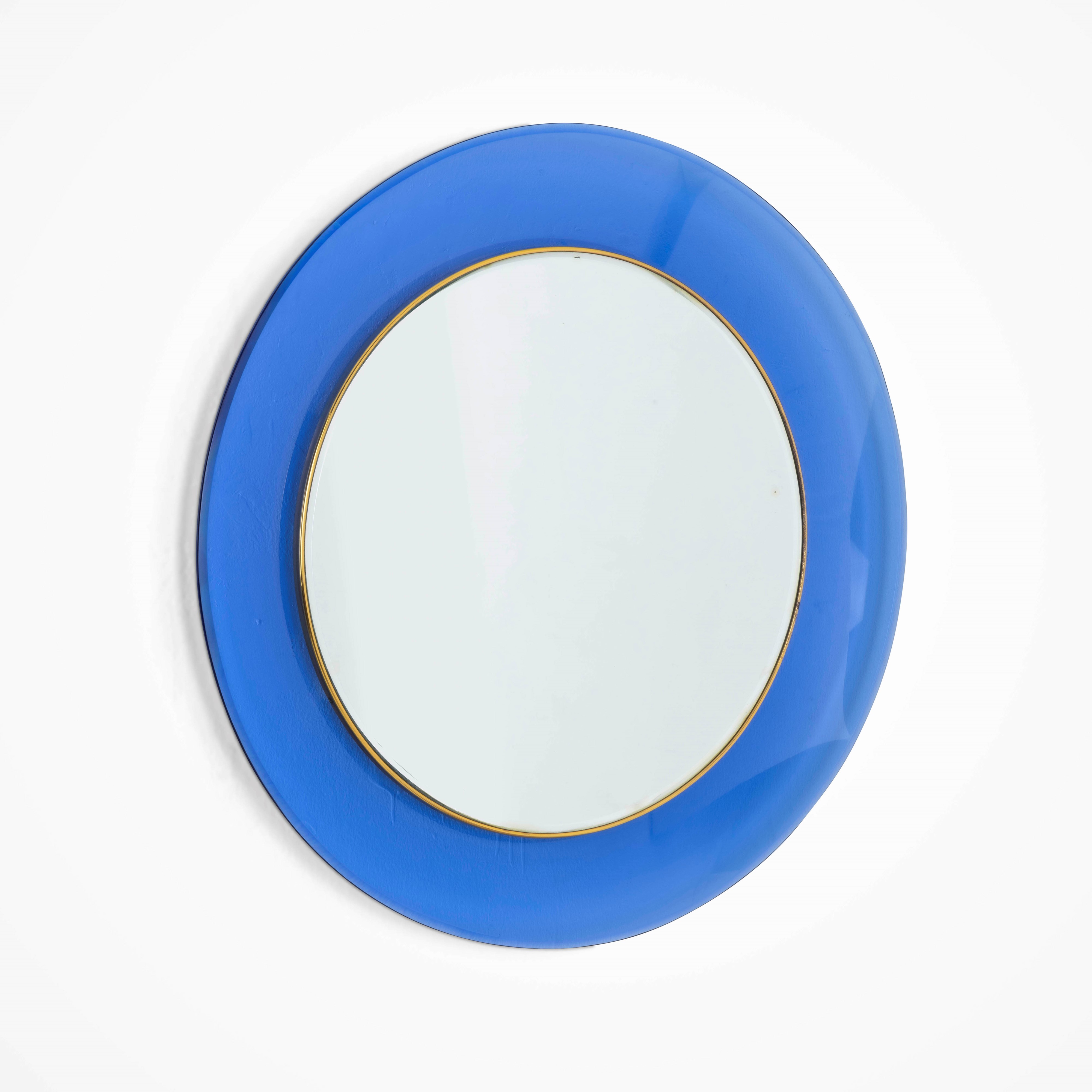 Struttura in cristallo colorato e cristallo specchiato e ottone. Etichetta originale.