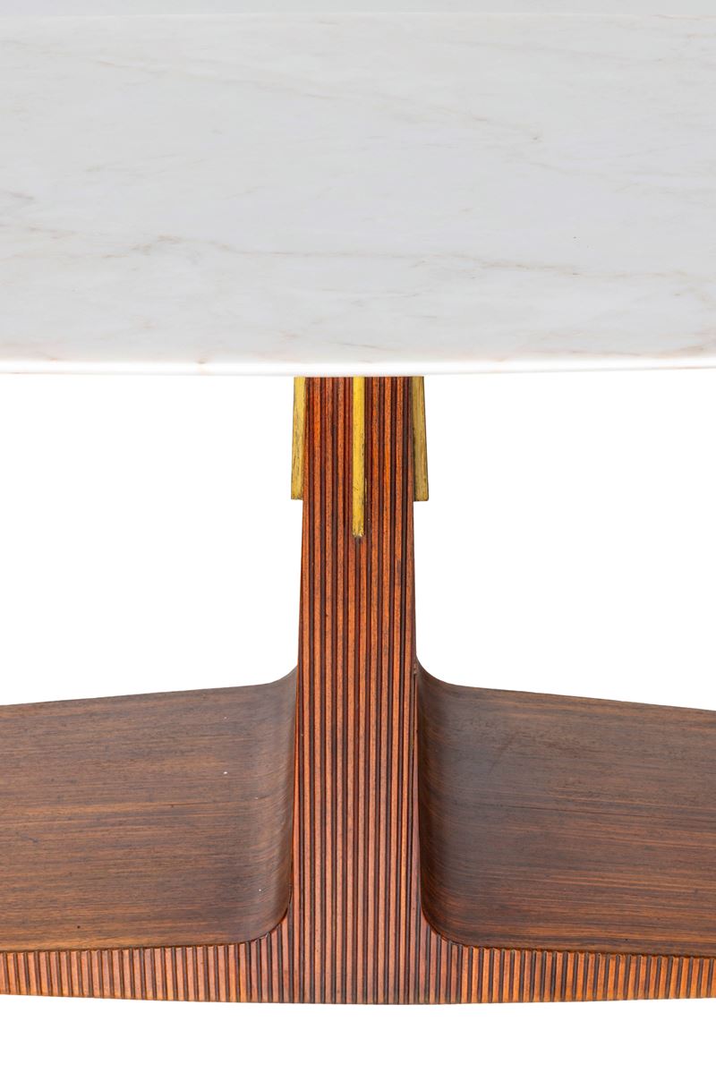 Struttura in legno, sostegno superiore in ottone e piano in marmo.
