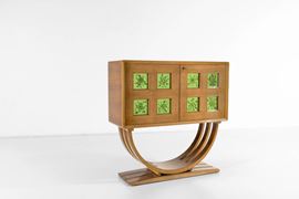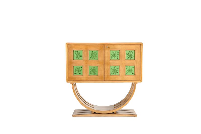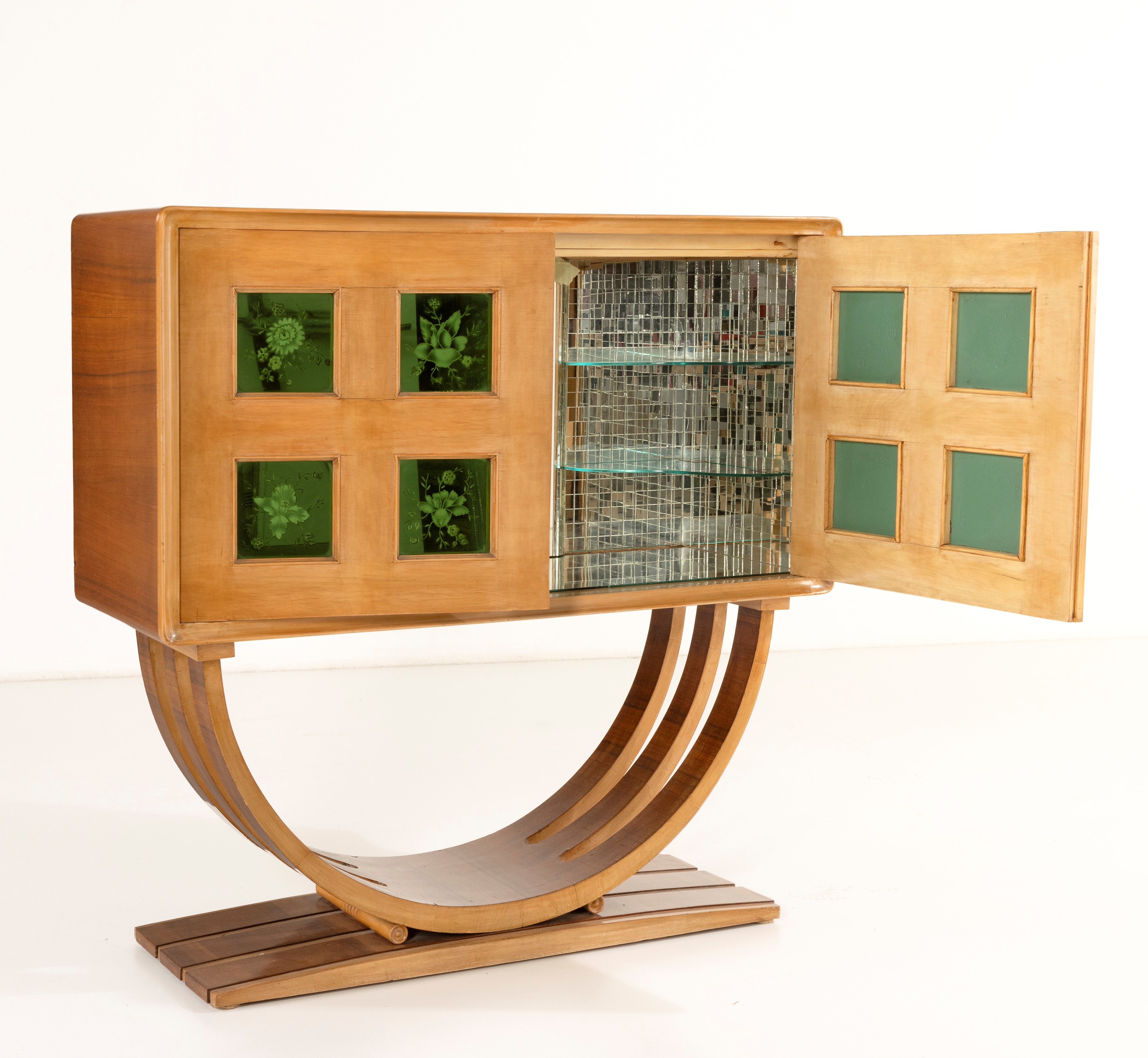 Struttura e sostegni in legno. Ante in legno con inserti in cristallo colorato decorato.