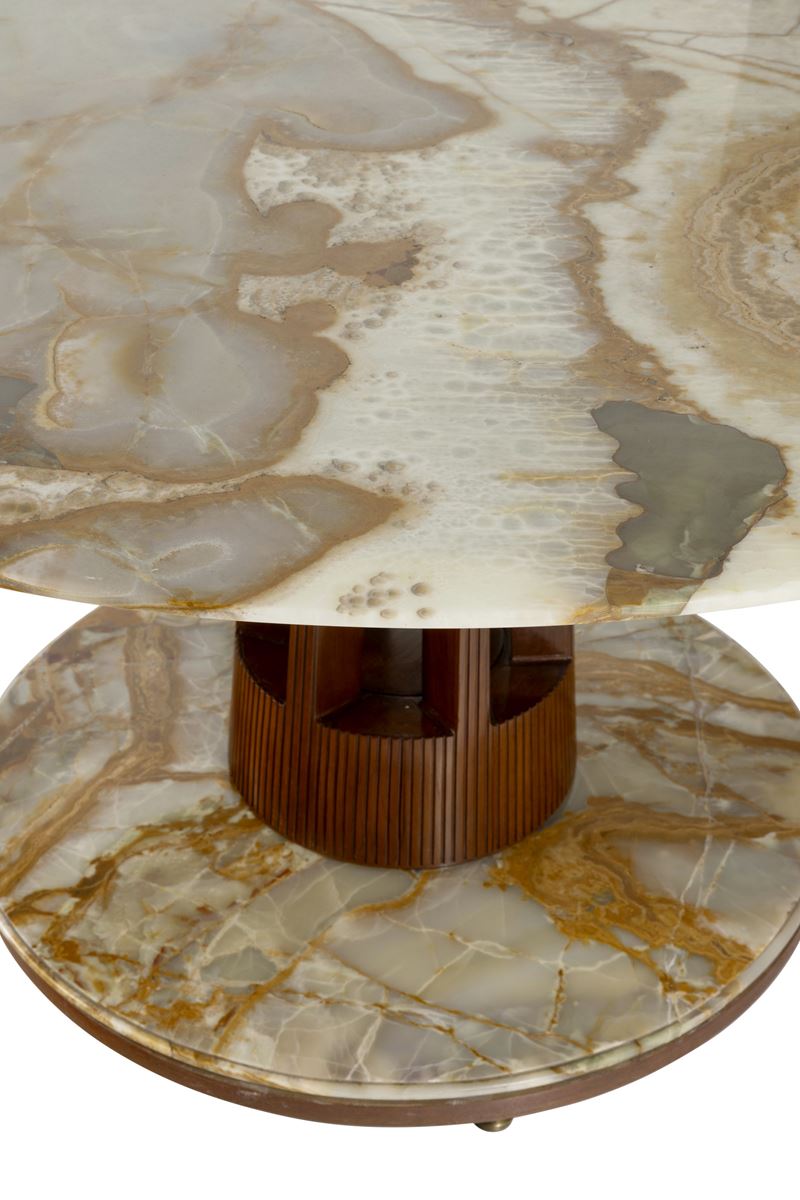 Struttura in legno, base in legno grissinato, piano e base in onice.