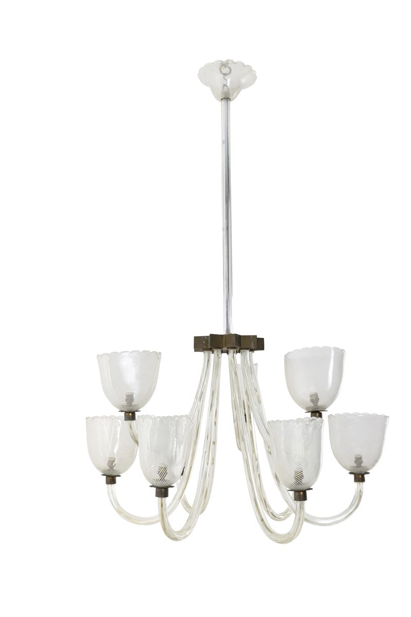 Struttura in ottone e in vetro di Murano con coppe in vetro di Murano rigato.
