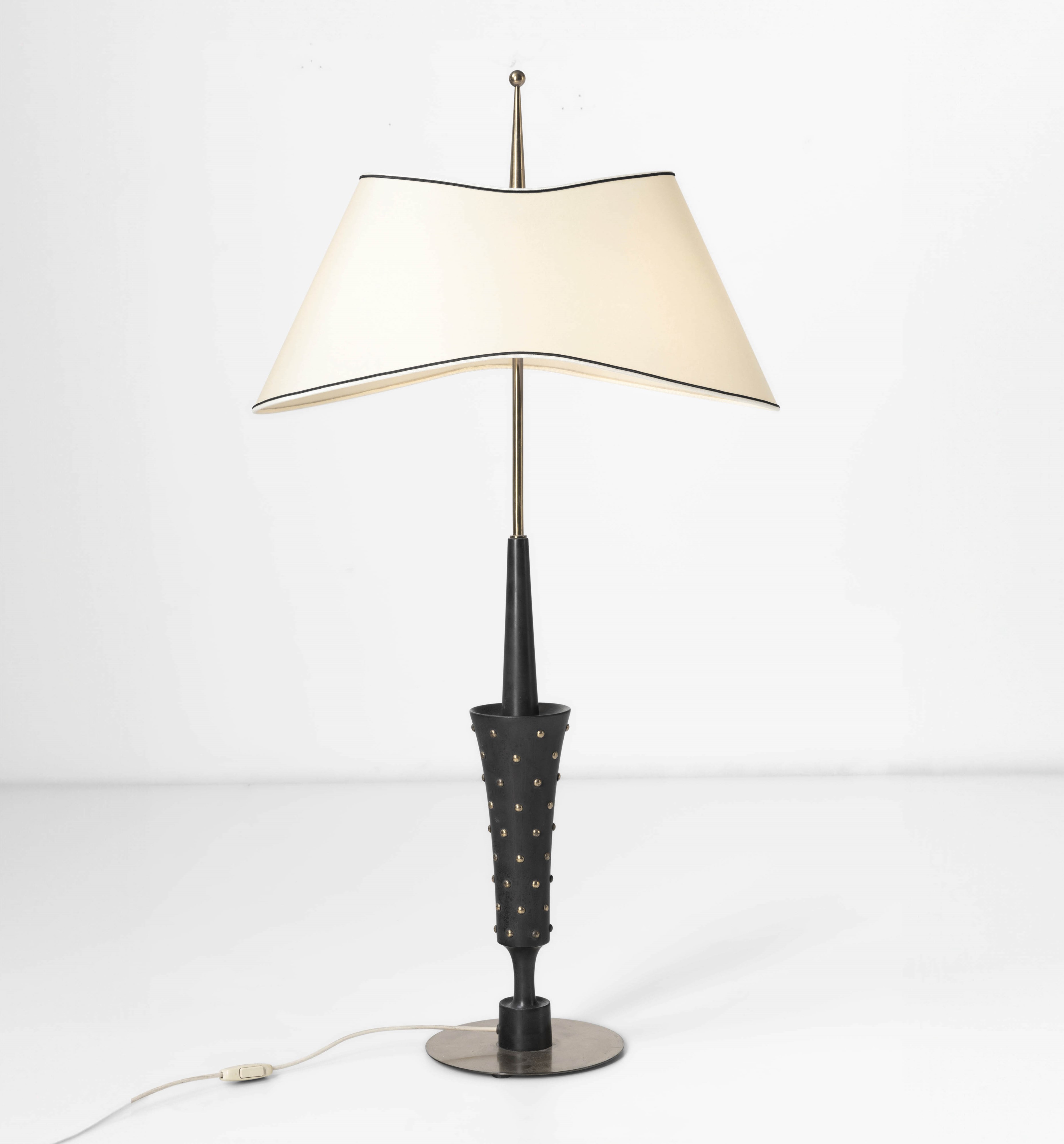 Base in ottone e struttura in legno ebanizzato con applicazioni in ottone.