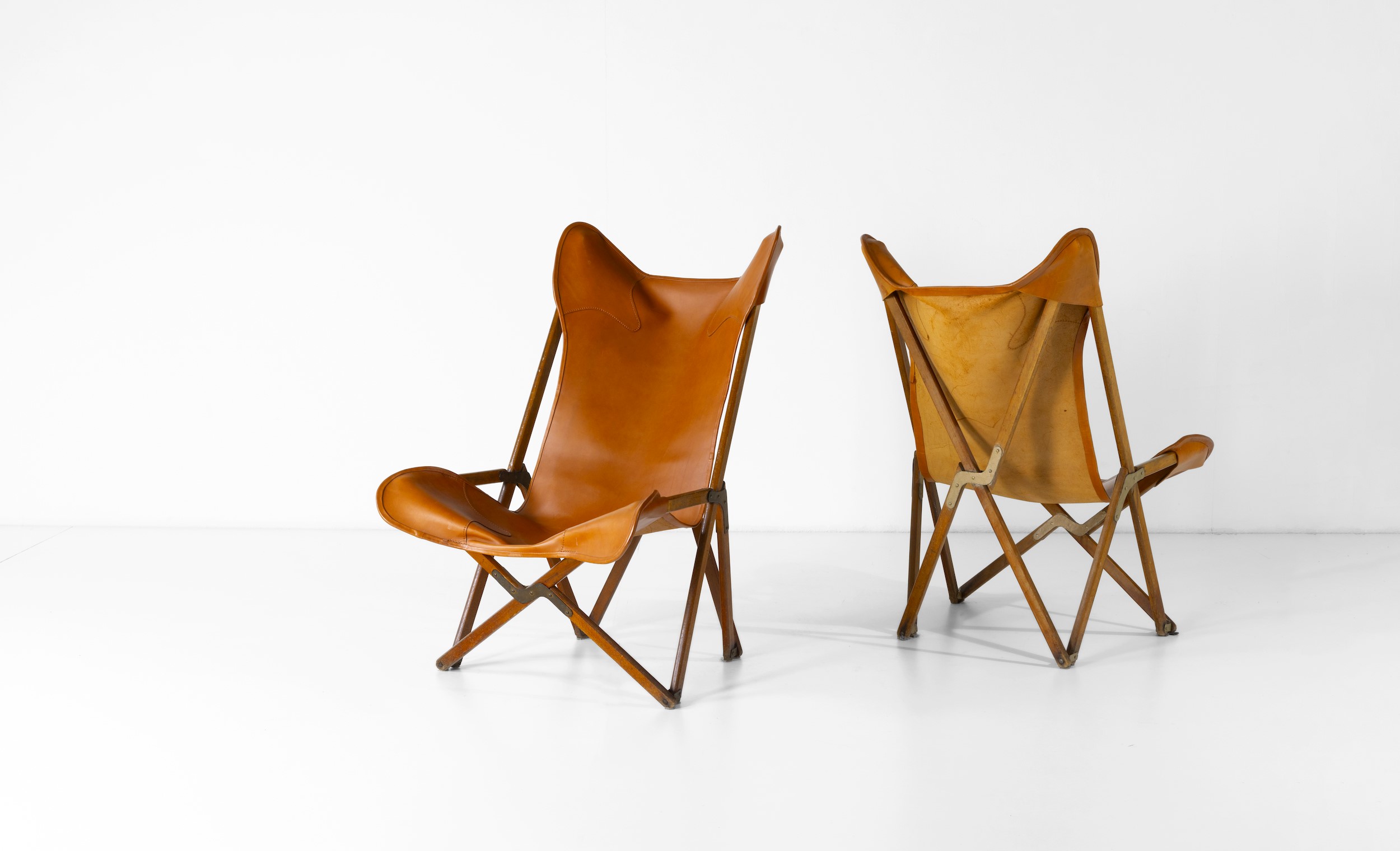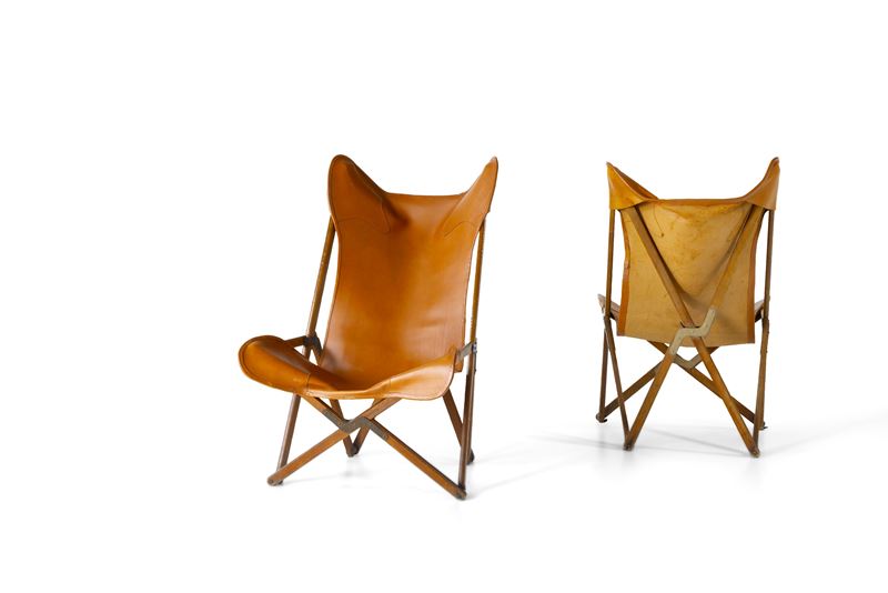 Struttura pieghevole in legno e rivestimento in pelle. Particolari in metallo.