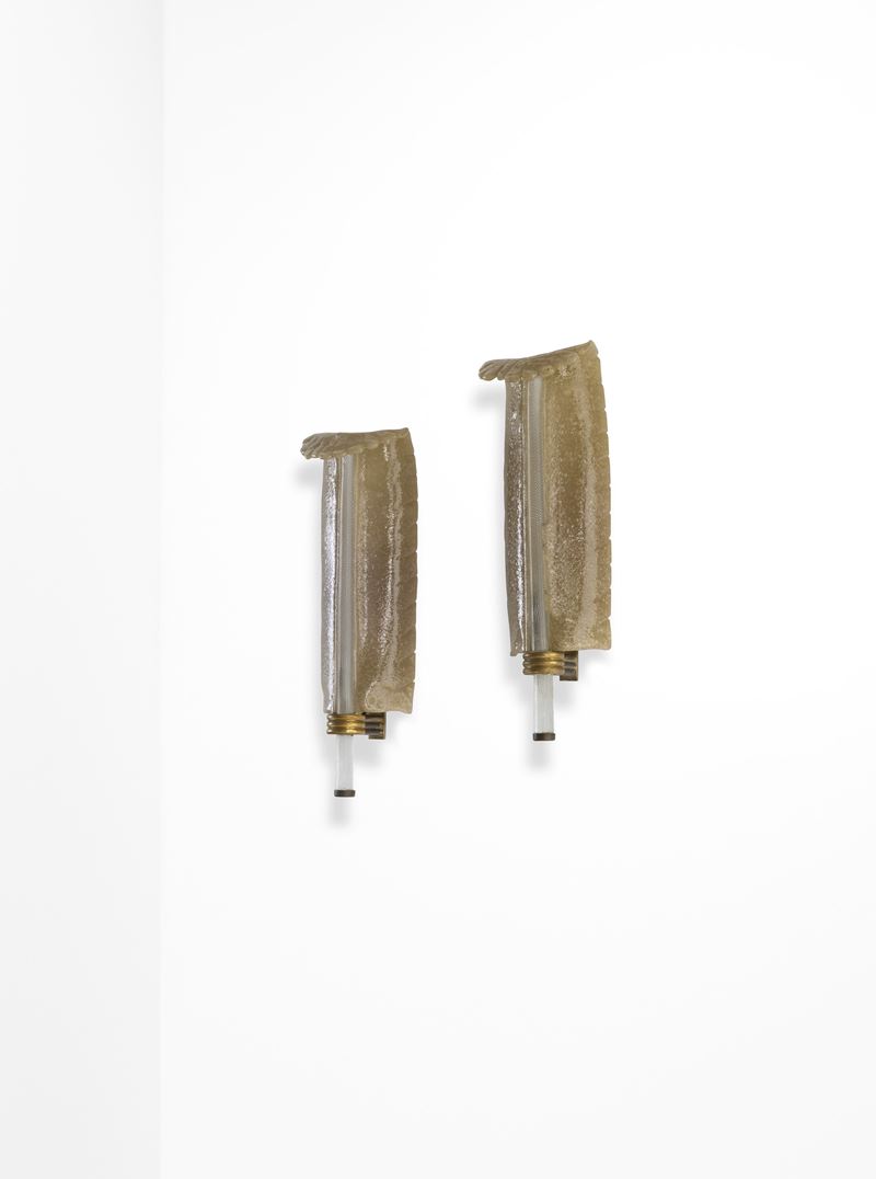Struttura in ottone e diffusori in vetro di Murano pulegoso con nervatura a filigrana.