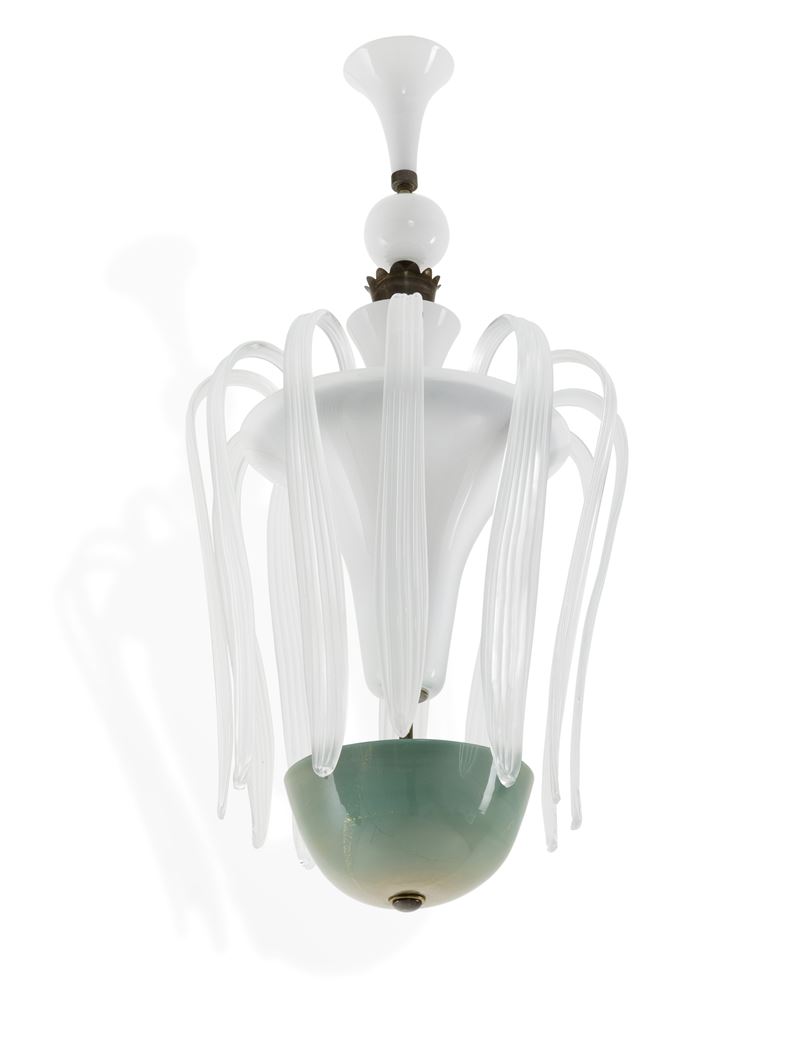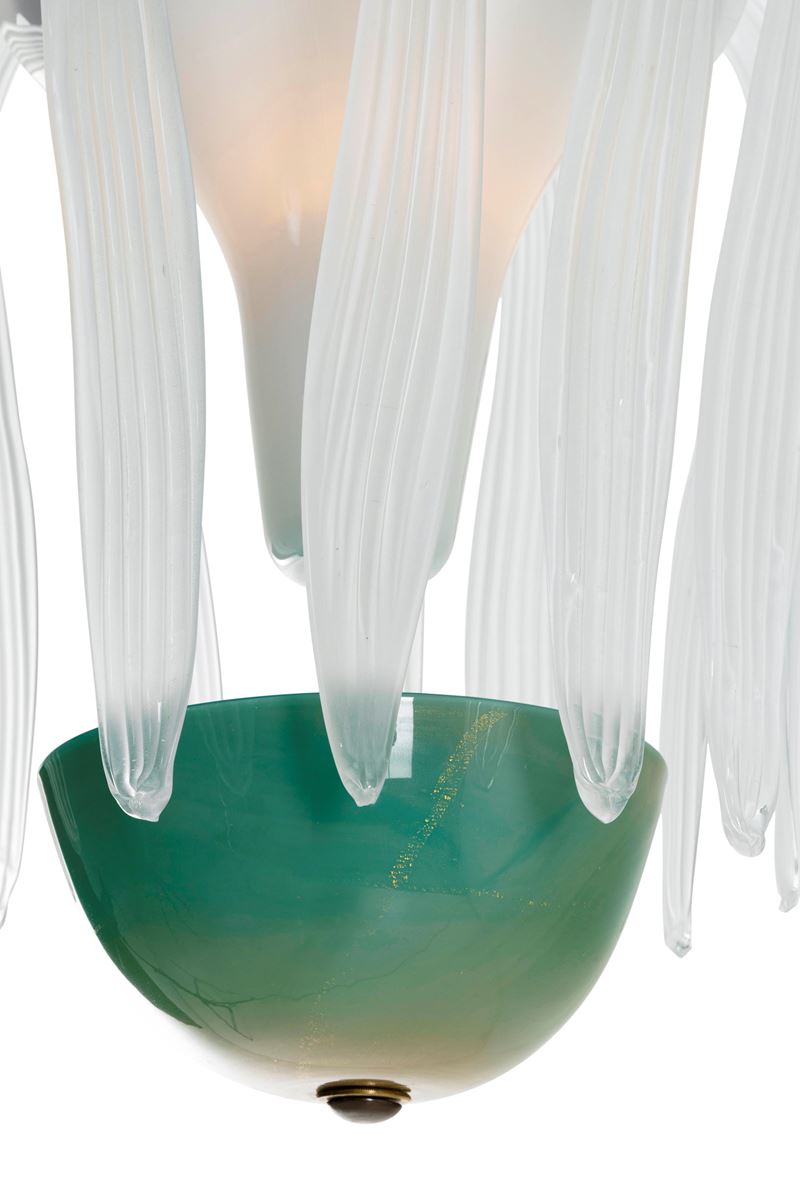 Sospensione con struttura in ottone, vetro di Murano pulegoso e colorato. Foglie in vetro di Murano cordonato.