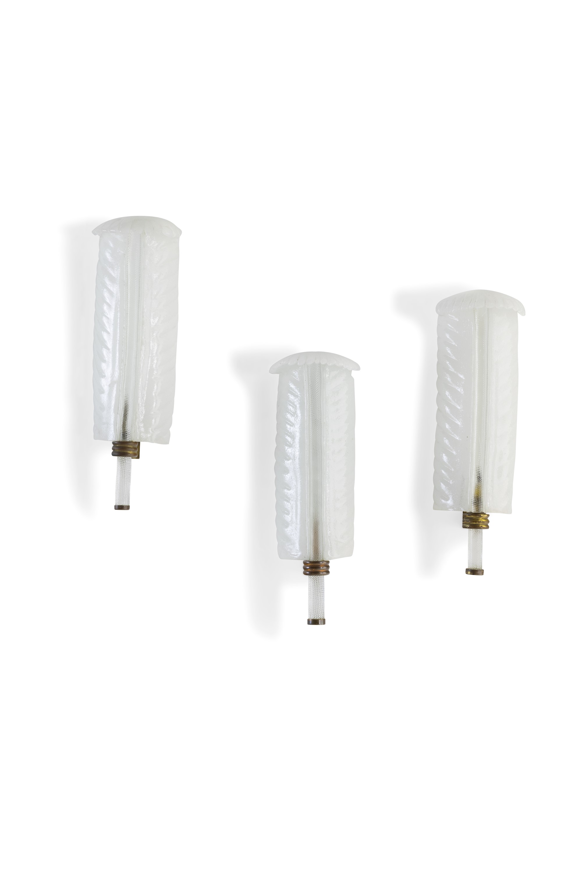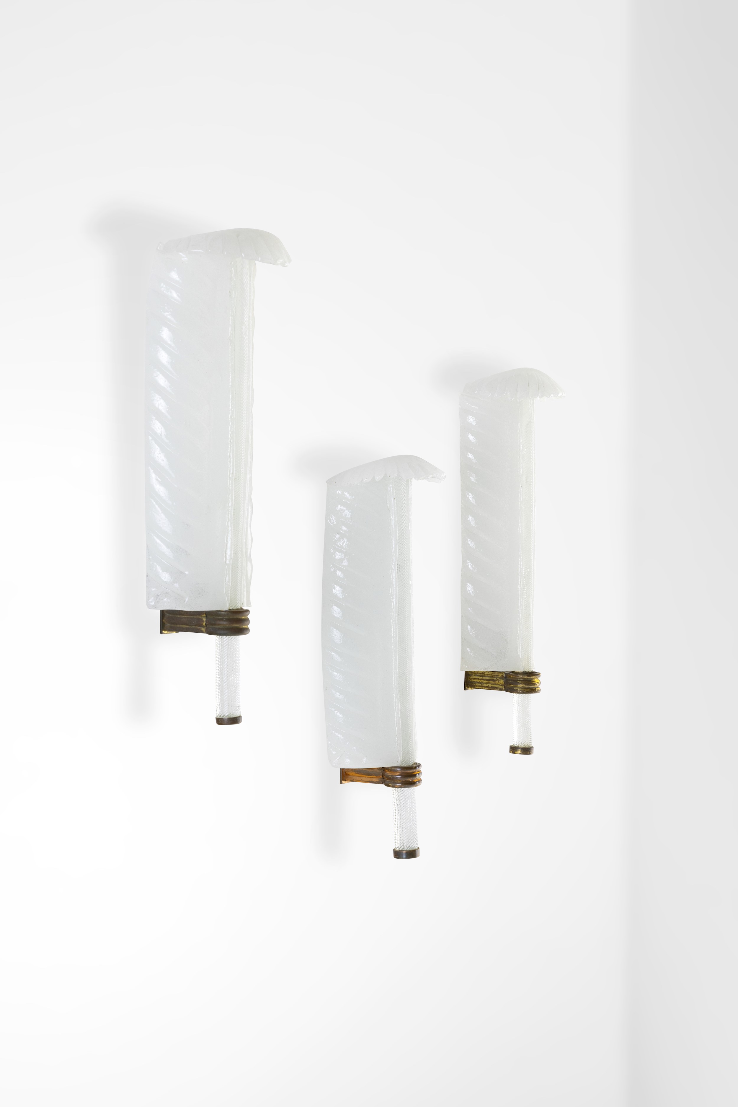 Struttura in ottone e diffusori in vetro di Murano Pulegoso con nervatura a filigrana.