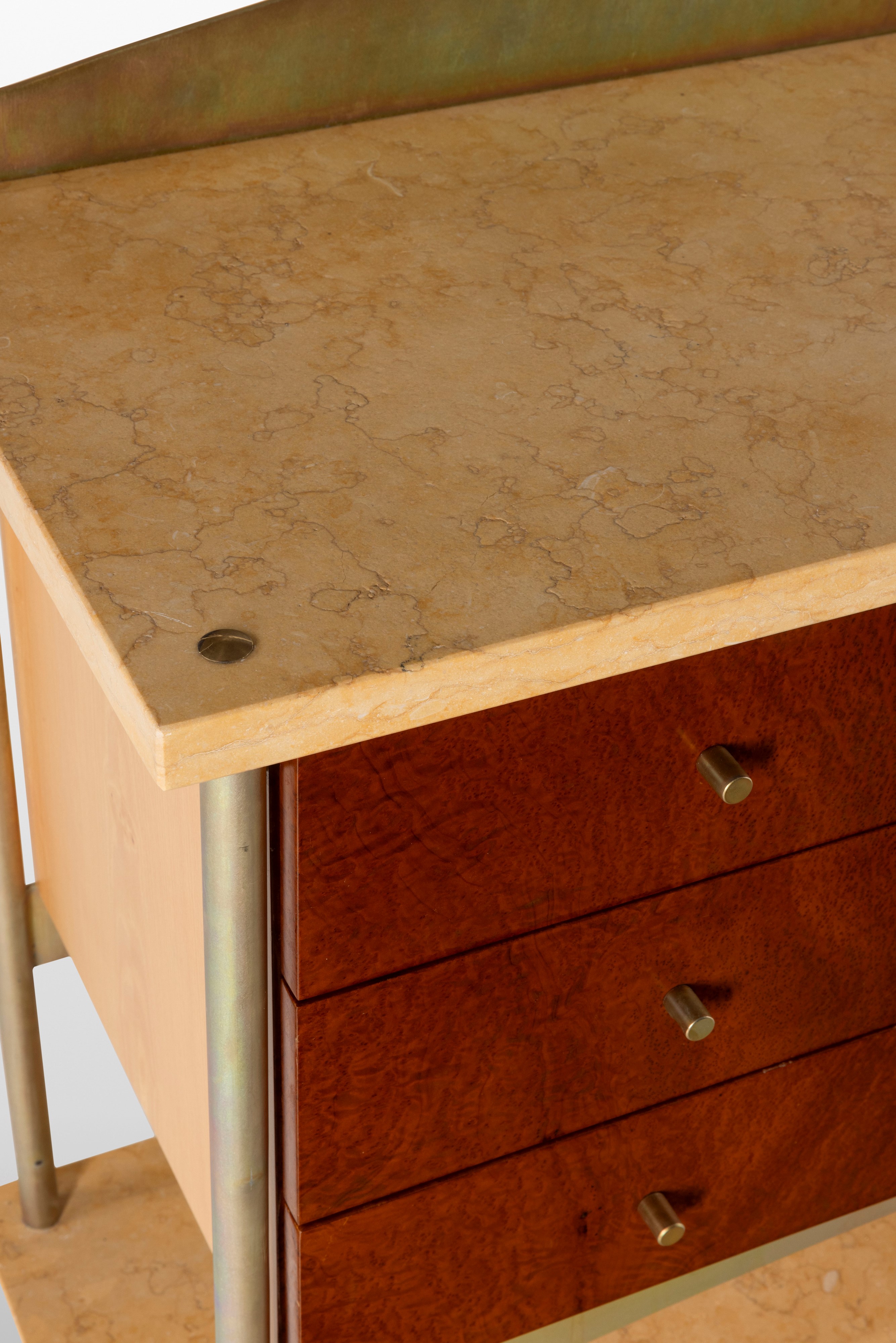 Sostegni in ottone, struttura in legno impiallacciato di radica e piano in travertino.