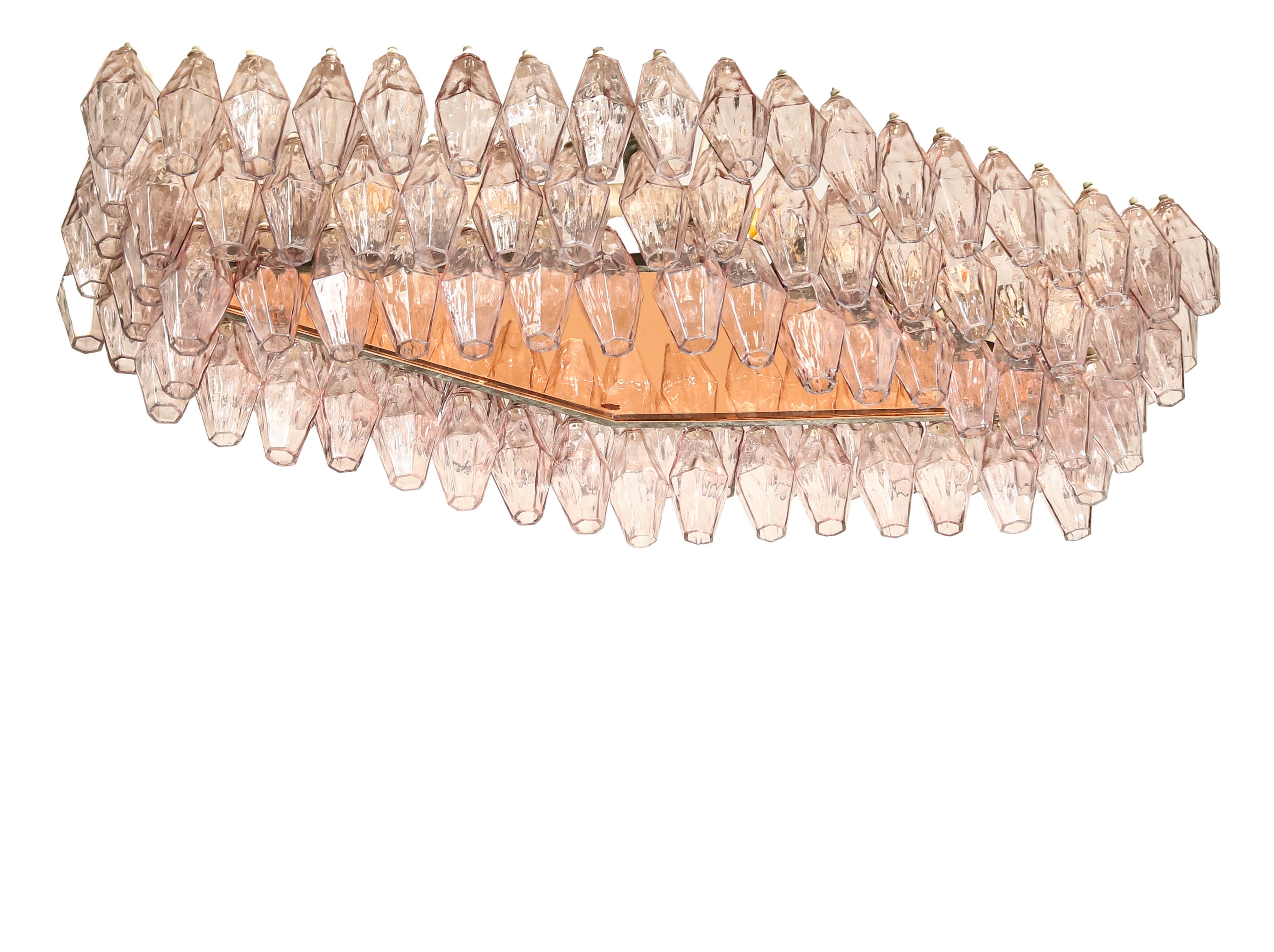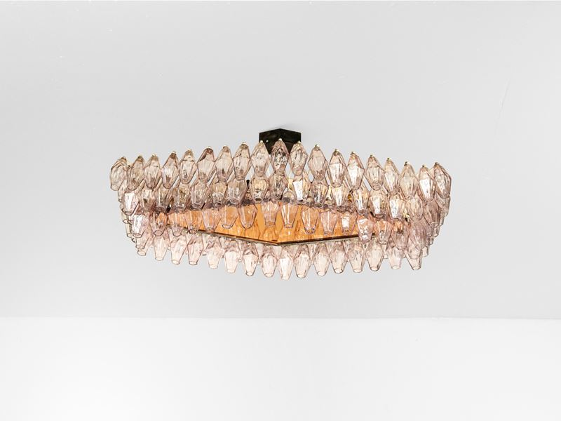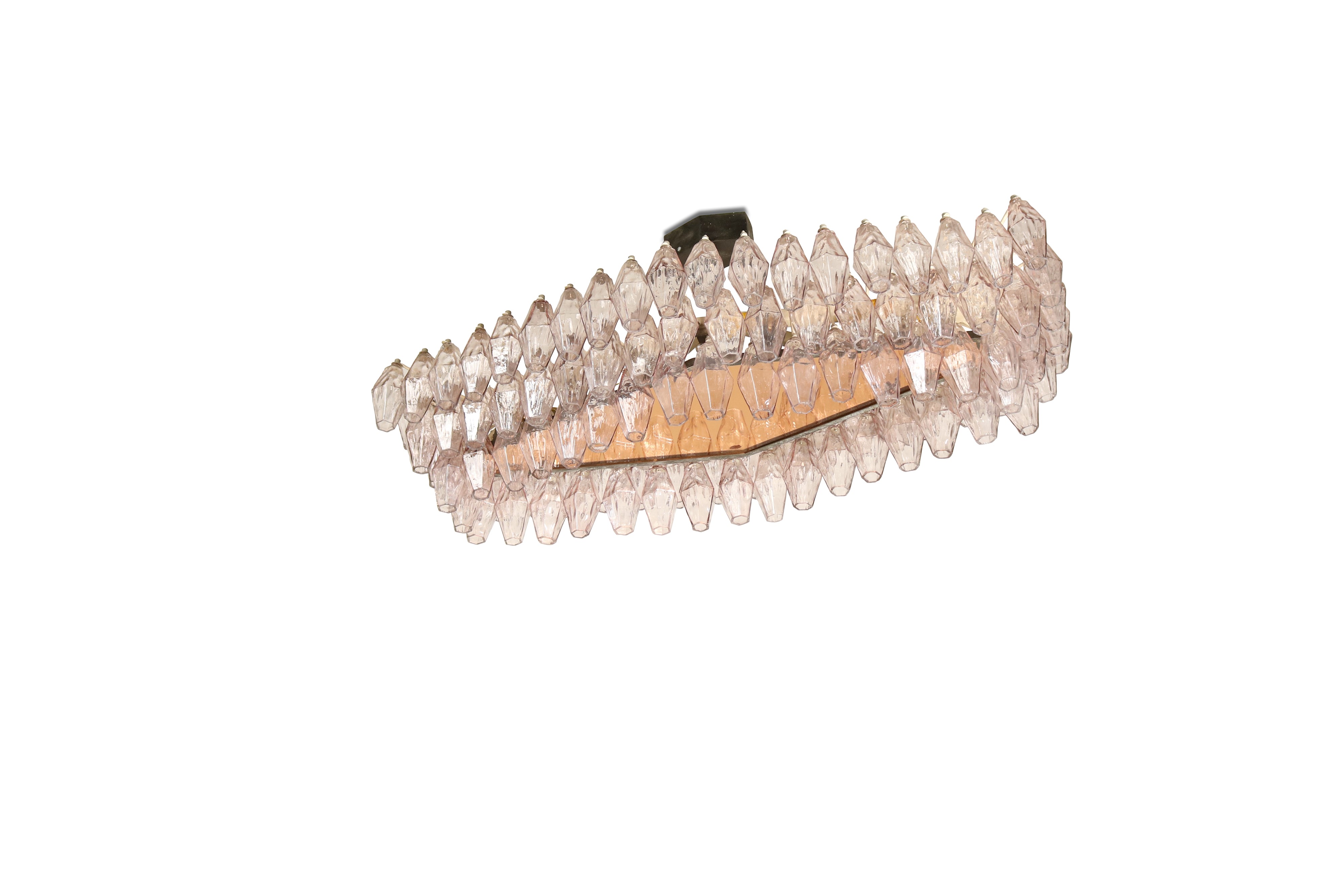 Struttura in metallo laccato e ottone. Elementi diffusori in vetro di Murano della serie Poliedri e diffusore centrale in cristallo specchiato colorato.