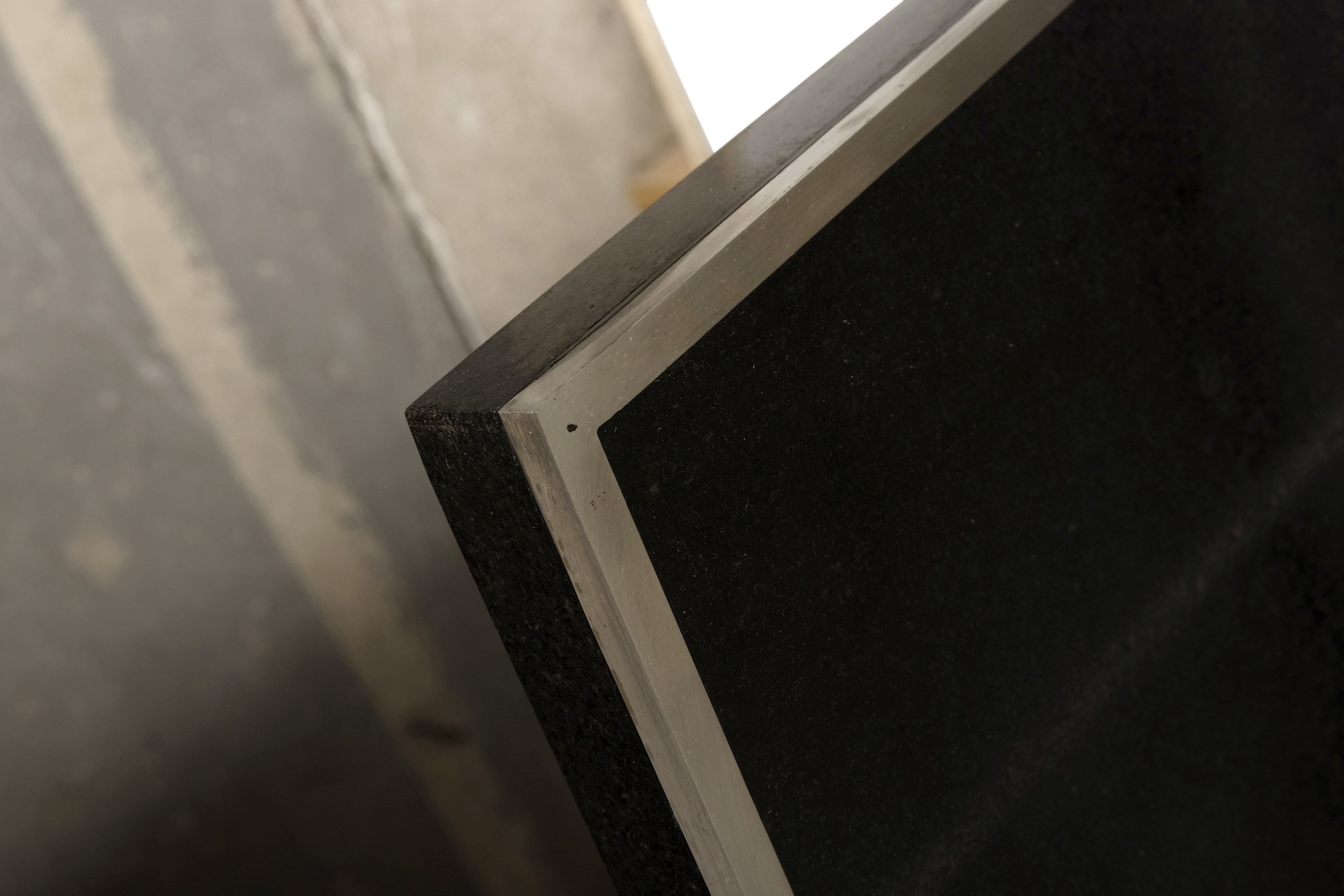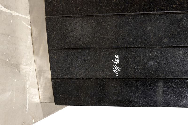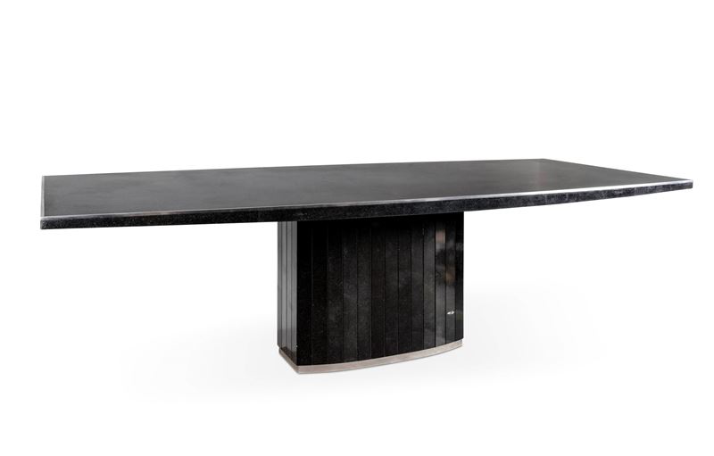 Struttura e piano in marmo con profili in acciaio spazzolato.