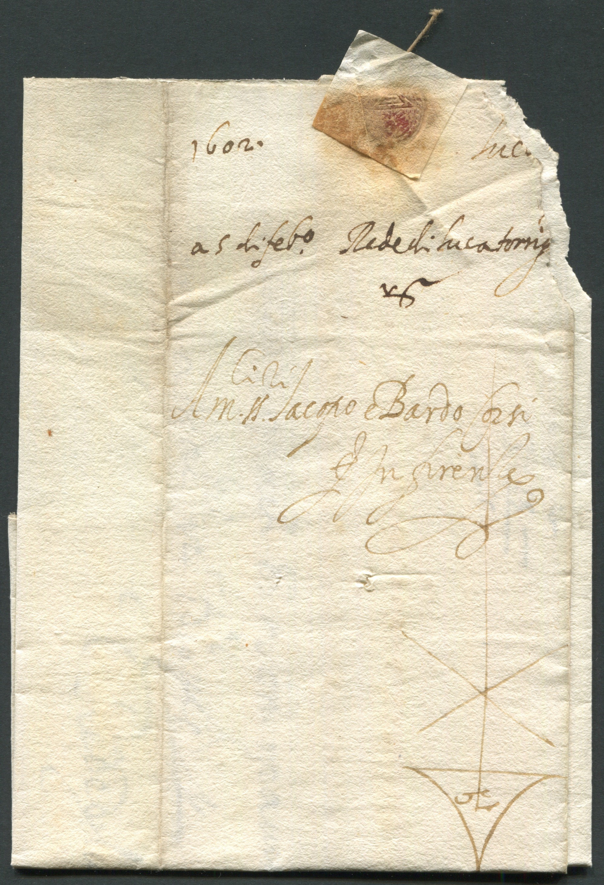 reca al recto segni della Gilda di appartenenza del mittente, il mercante Rede di Luca (inusuale utilizzo per l’epoca), sigillo e “filo canapis” (raro all’epoca). Al verso tassa pagata. Interessante