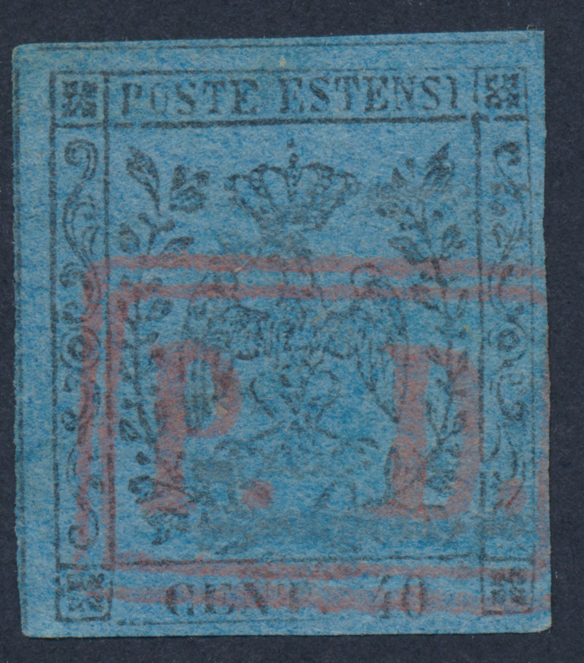1852, Modena, 40c. azzurro scuro senza punto dopo la cifra (6) annullato “P. D.” in doppia cartella in rosso
