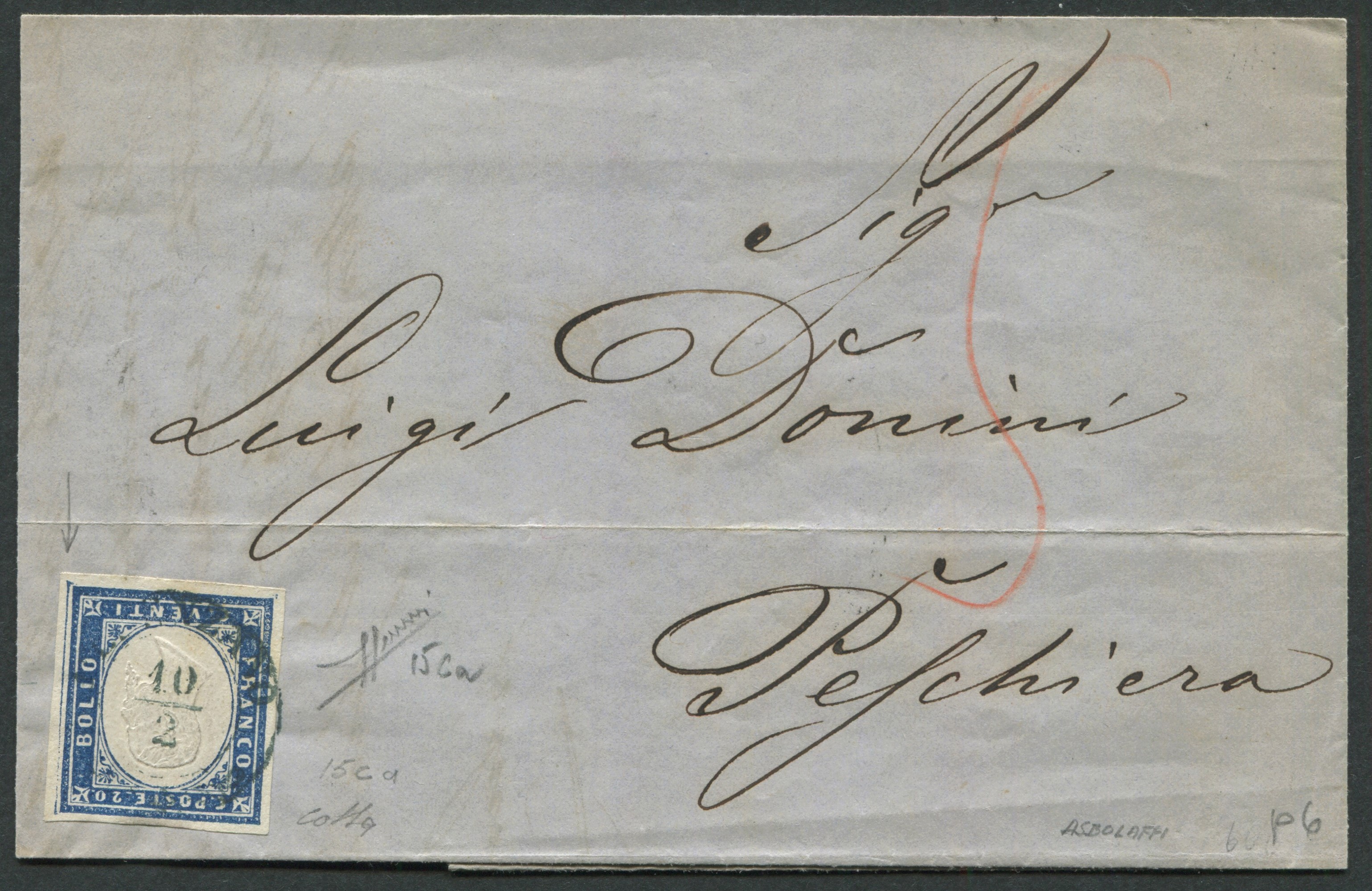 1860, Sardegna, Lettera da Desenzano a Peschiera affrancata con IV emissione 20c. azzurro (15Ca)
