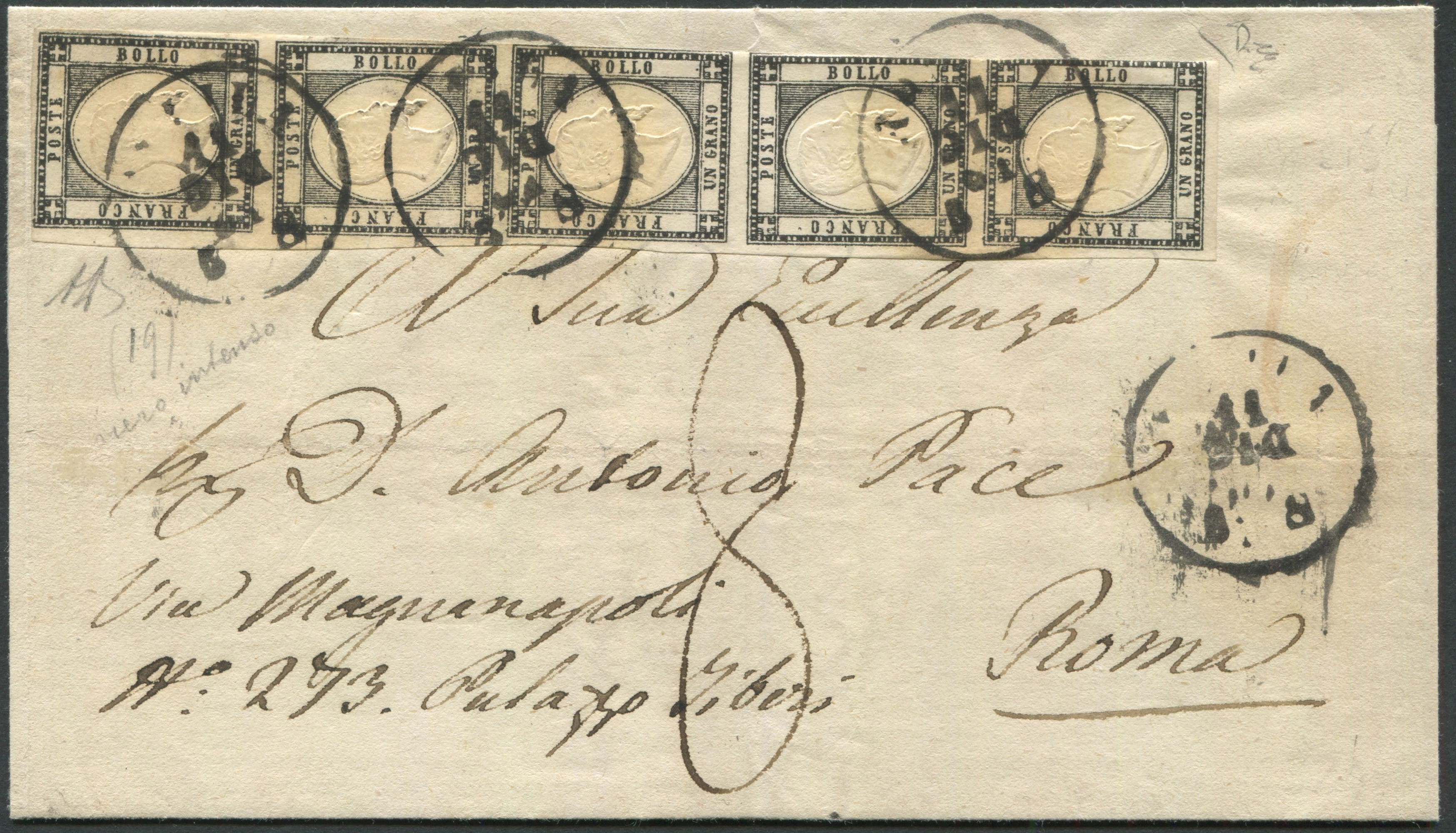 Lettera dall’Aquila per Roma dell’11 Dicembre 1861, affrancata con striscia verticale di 5 esemplari dell’1 grano nero intenso. I primi 3 perfetti, la coppia inferiore corta a destra. Di ottimo aspetto, tassa di 8 baj in arrivo a Roma. Rara, alto valore di catalogo. A.Diena, Cert. E.Diena.