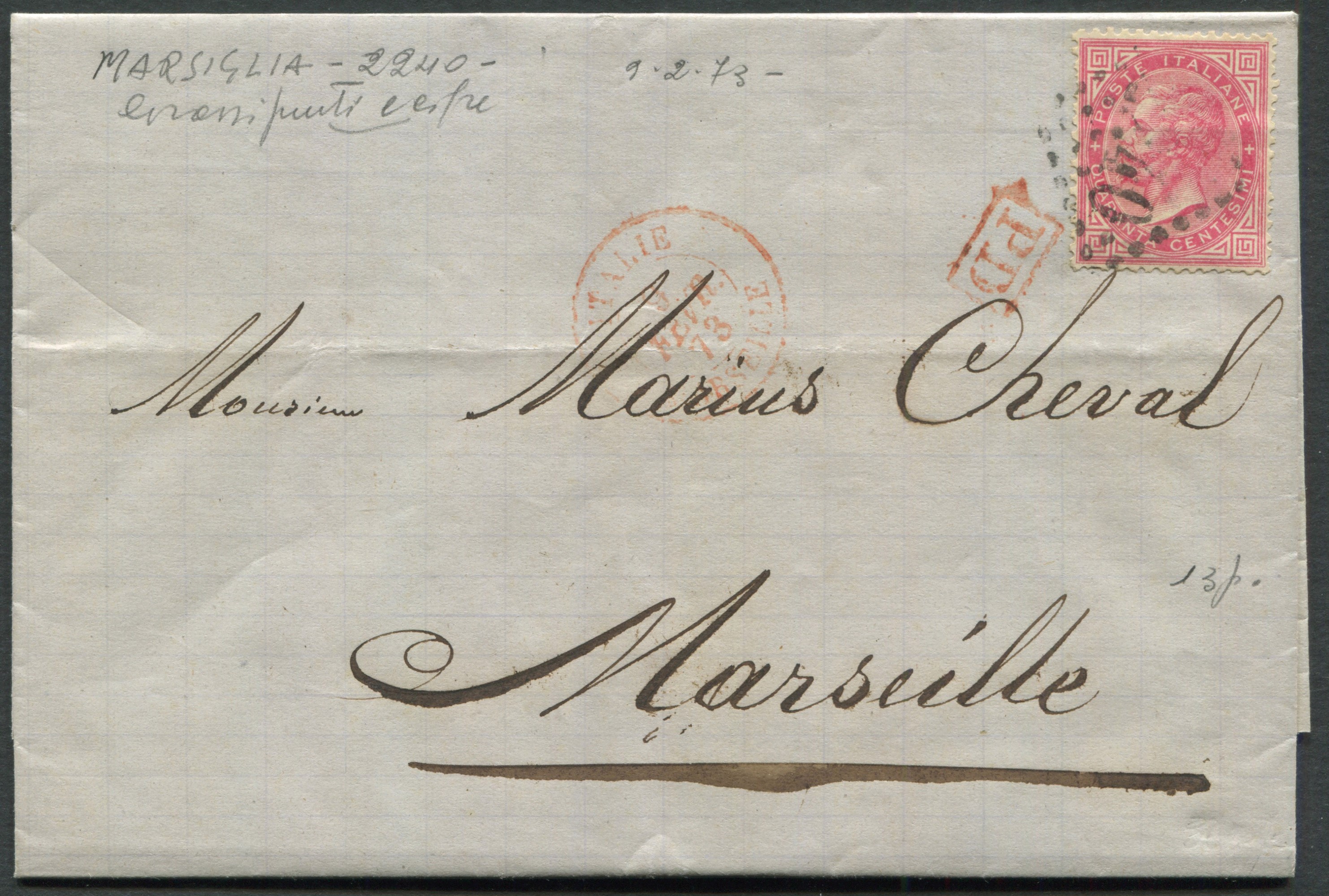 Lettera da Genova per Marsiglia dell’8 febbraio 1873, affrancata con 40 c. DLR (S. L. 20), annullato in arrivo col numerale a punti piccoli con cifre grandi (P. 13). Non comune, molto bella.
