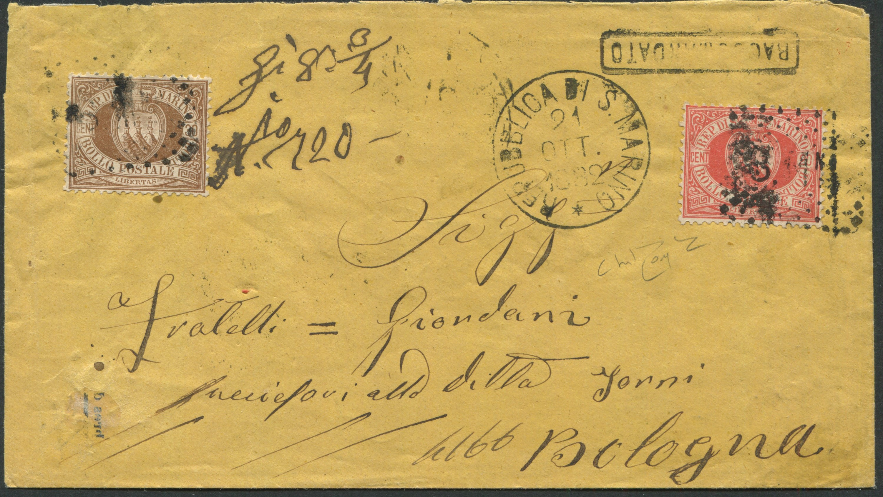 1882, S.Marino, Raccomandata per Bologna, affrancata con 20 c. rosso e 30 c. bruno chiaro (4, 6a)