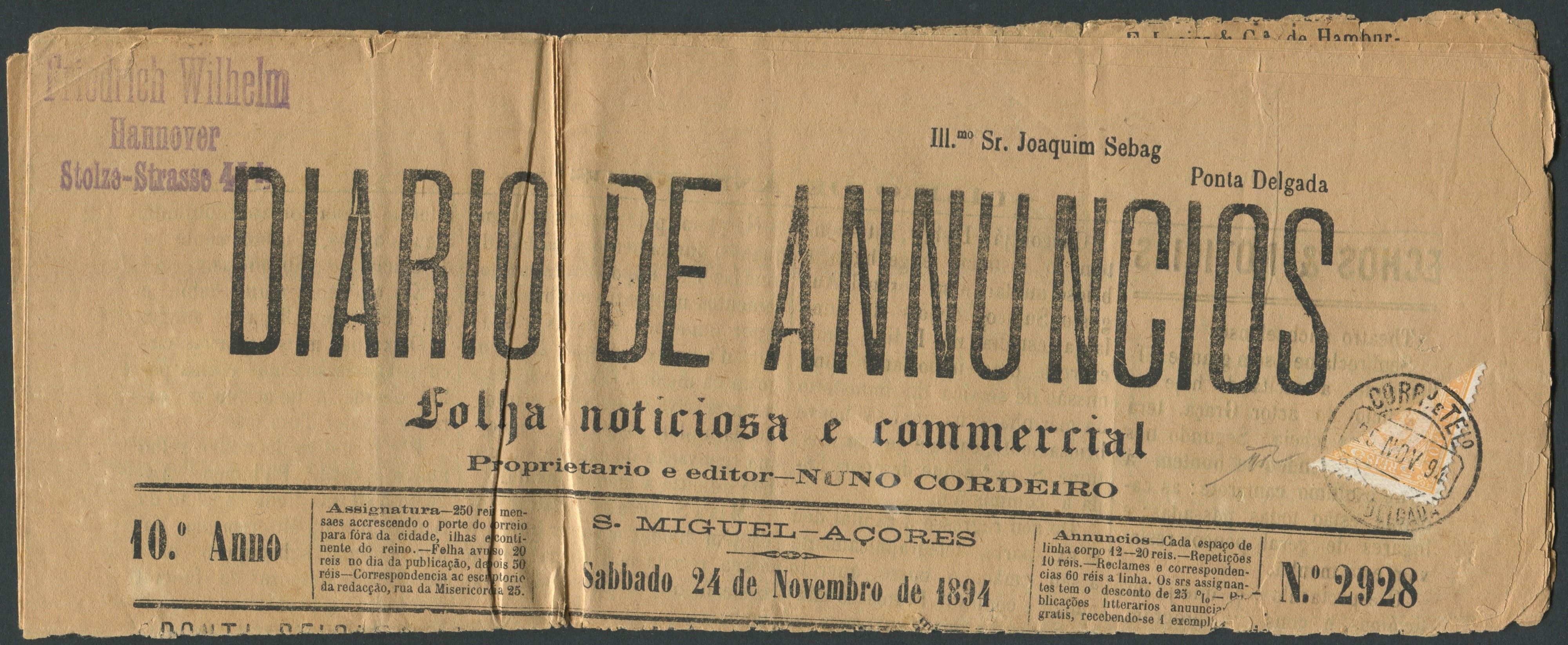 Giornale “Diario de Annuncios” affrancato con francobollo frazionato 5 reis giallo arancio “Effige di Carlo I” da Ponta Delgada (Azzorre) a Hannover, Annullo Circolare 25 novembre 1894. Firma: Migliavacca