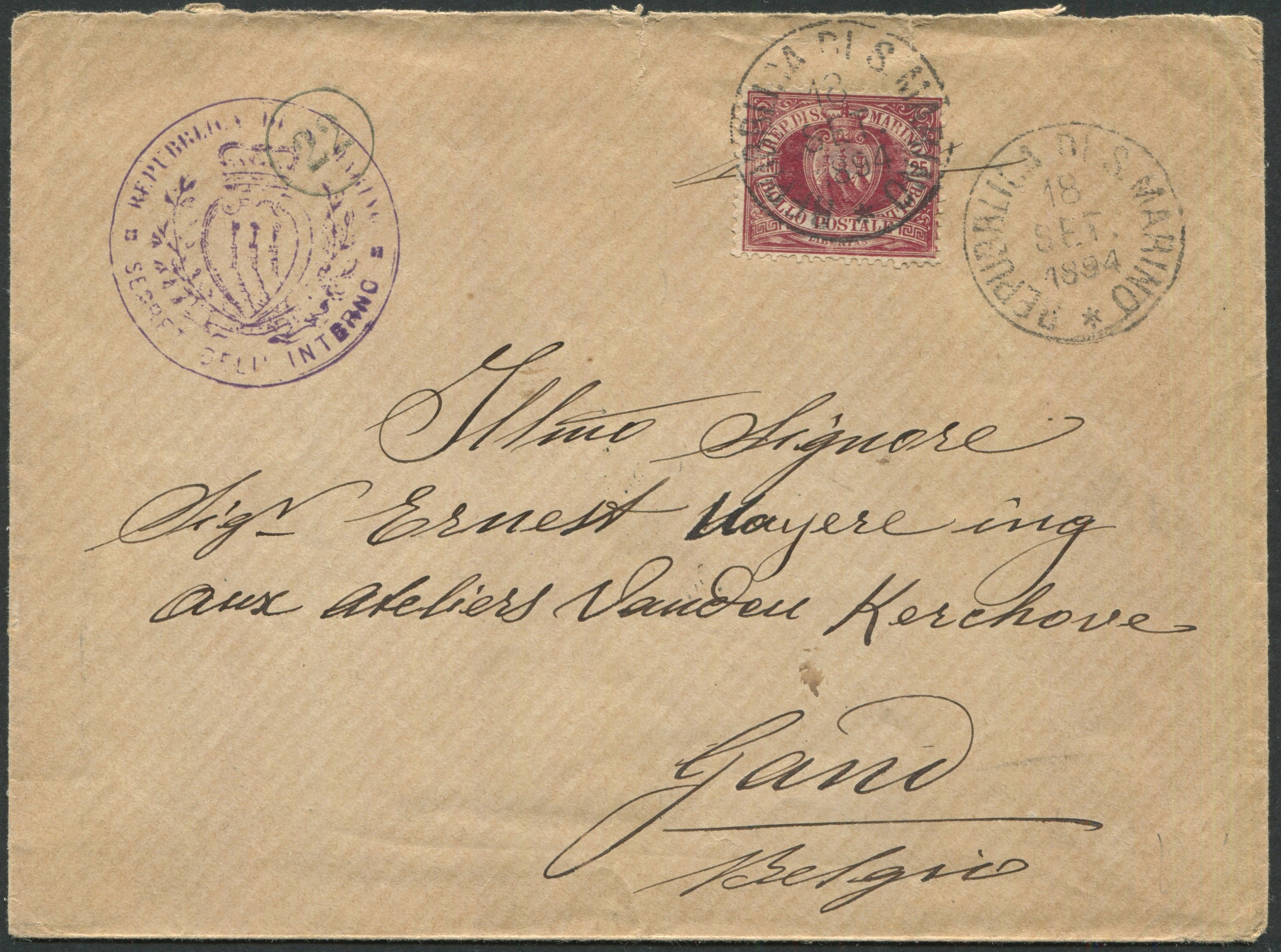 1894, S.Marino, Busta per Gand (Belgio) affrancata per 25c. (5)