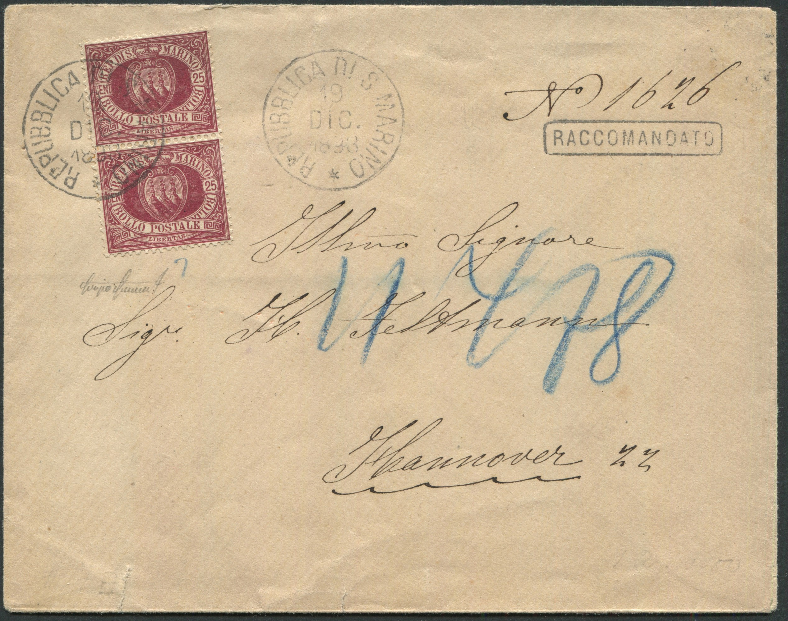 1898, S.Marino, Raccomandata per Hannover, affrancata con coppia del 25 c. lacca (5)