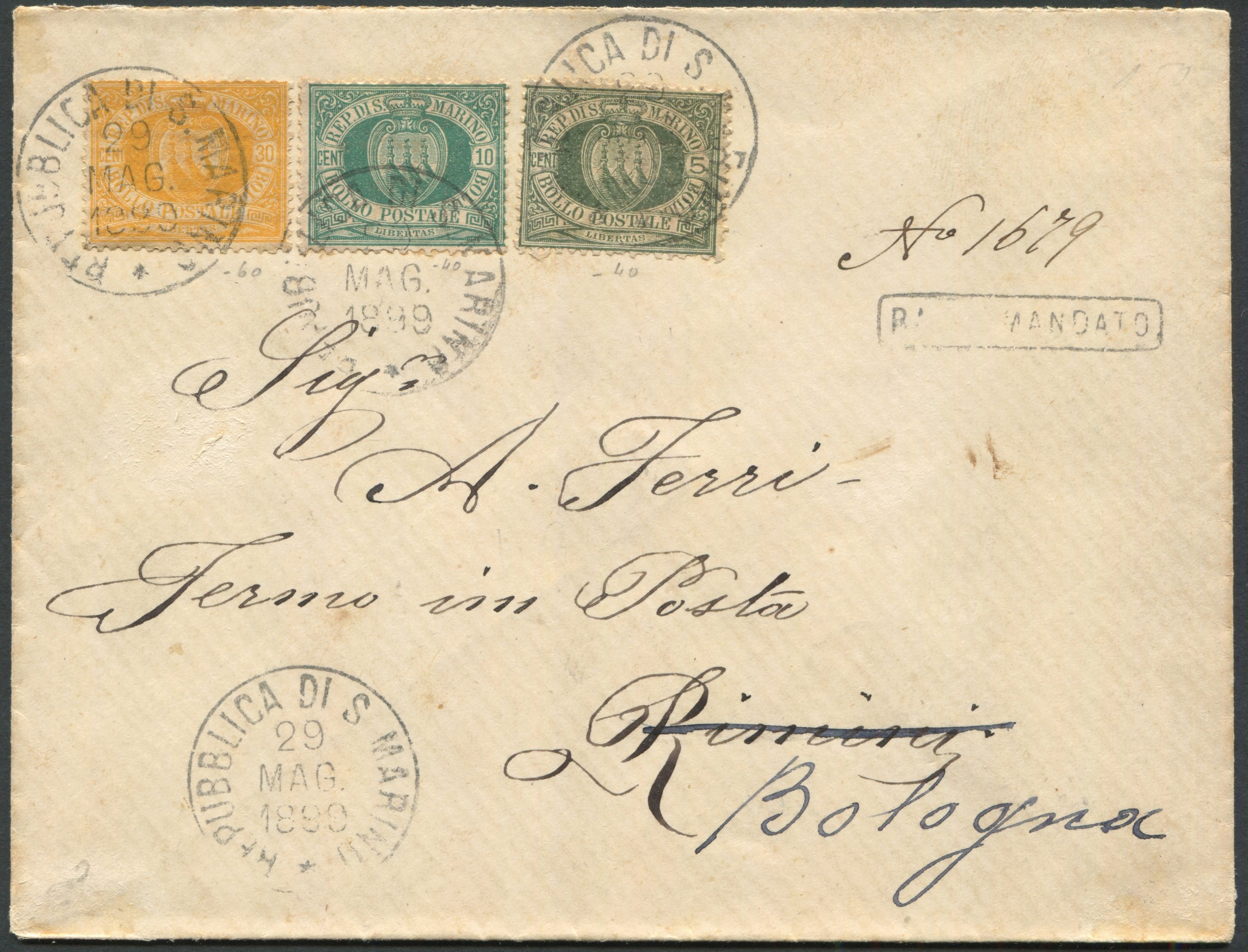 1899, S.Marino, Busta raccomandata per Rimini, rispedita a Bologna, affrancata con 5, 10 e 30 cent. (13a, 14 e 16)