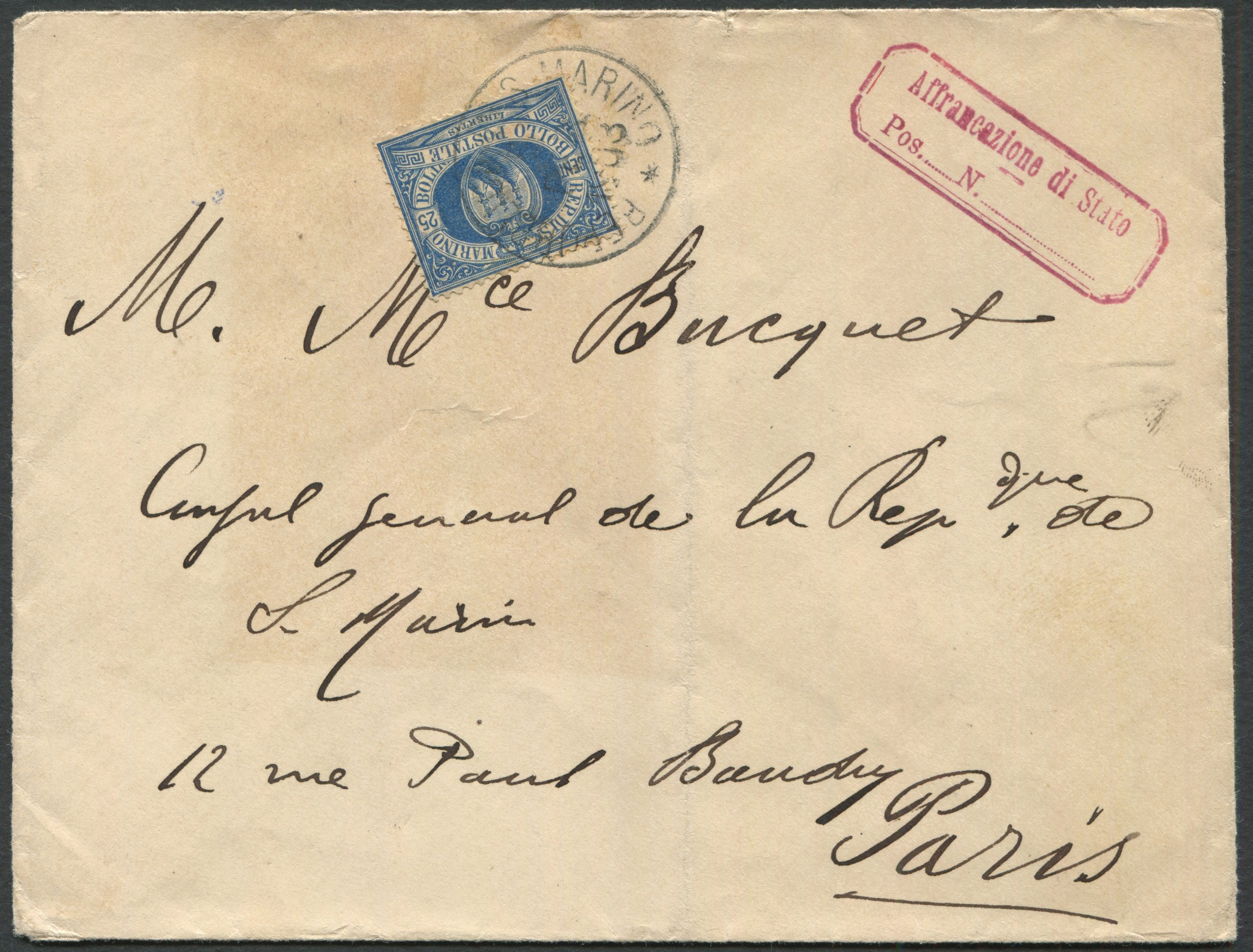 1903, S.Marino, Busta per il Console Generale di S. Marino a Parigi, affrancata con 25c. azzurro (30)