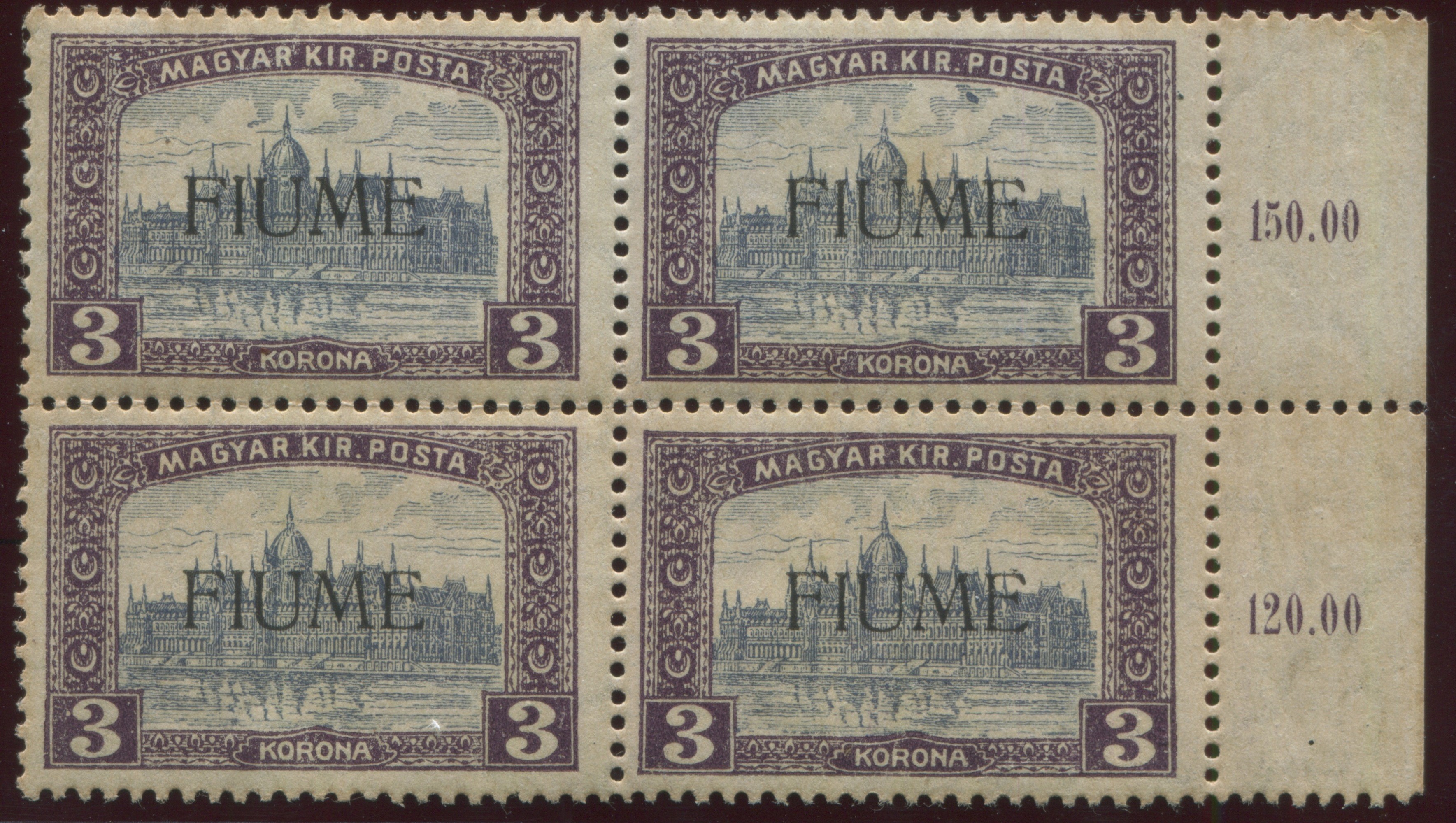 1918-19, Occupazioni 1 Guerra Mondiale, Terre Redente, Fiume, serie “Vedute”, 3k. violetto e grigio (19), quartina gomma originale integra bdf.