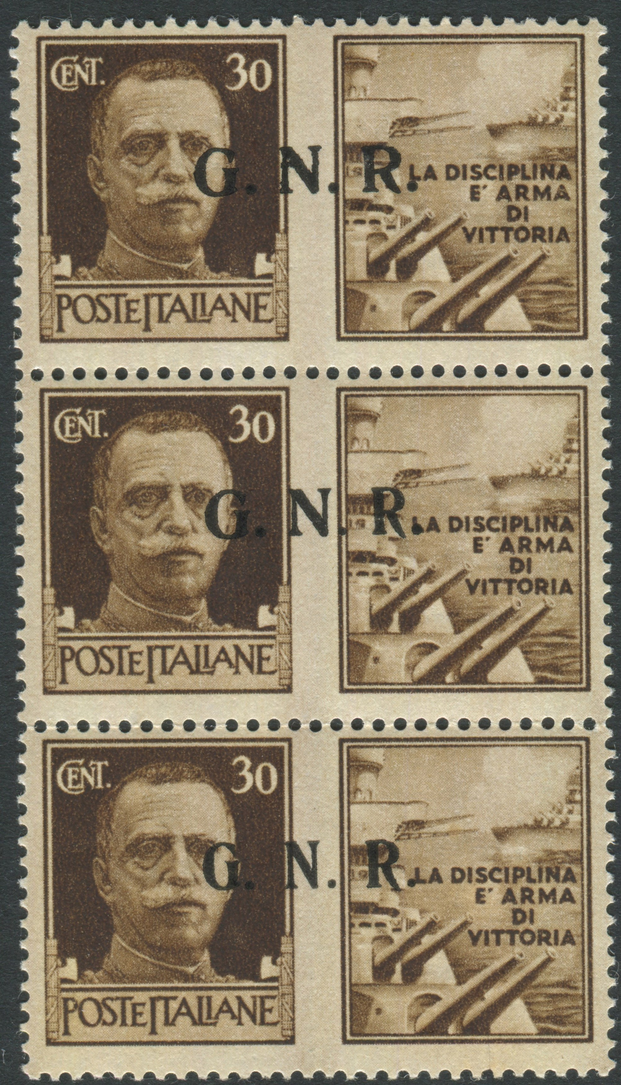 1944, Repubblica Sociale Italiane, Propaganda di Guerra. 30 cent. bruno I tipo, “trittico” di cui il primo es. con la soprastampa del II tipo, il terzo con la soprastampa del III tipo e quello centrale con la soprastamp “G.N. “ del II tipo ed “R” del III (17/I, 17/Ia e 17/II).