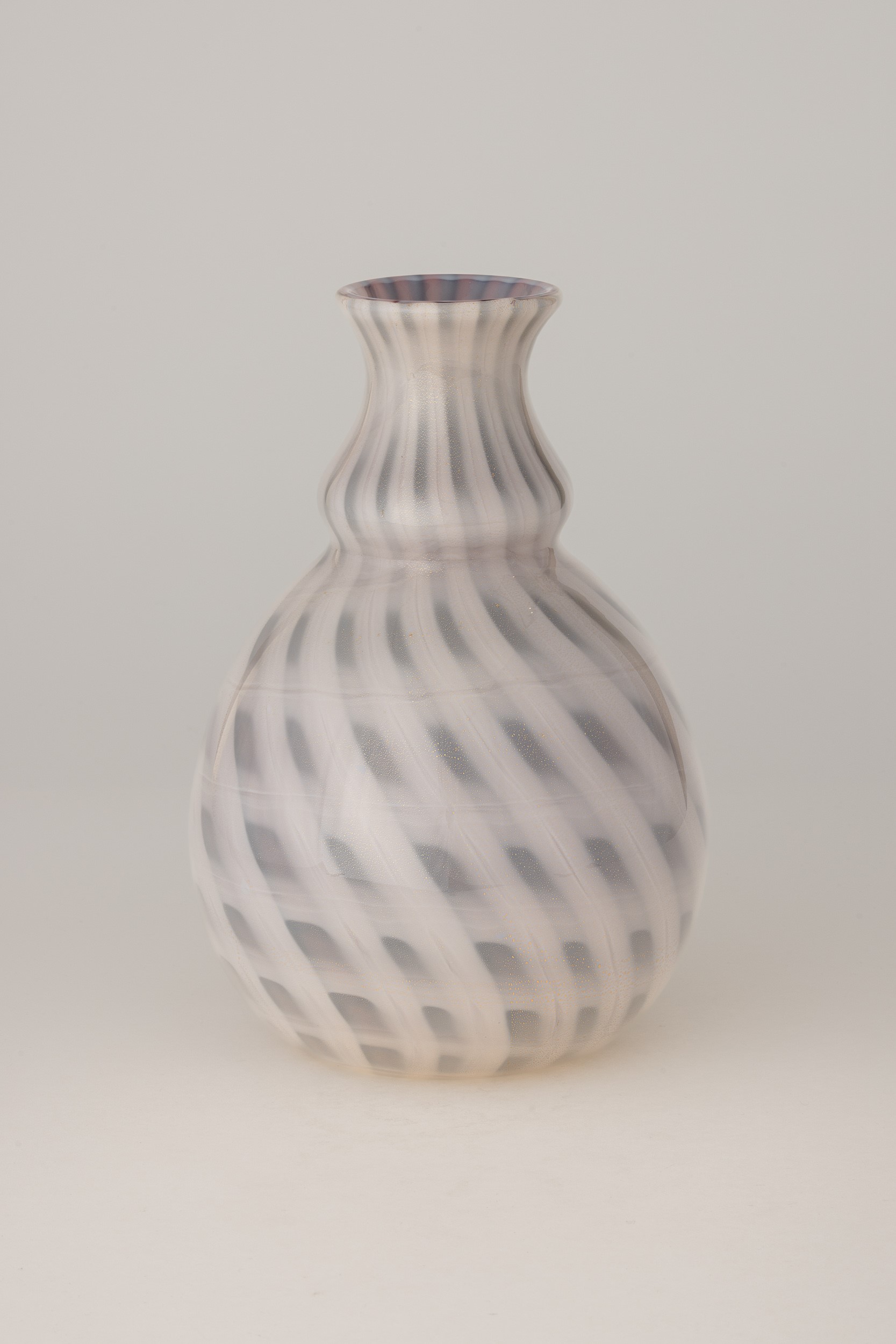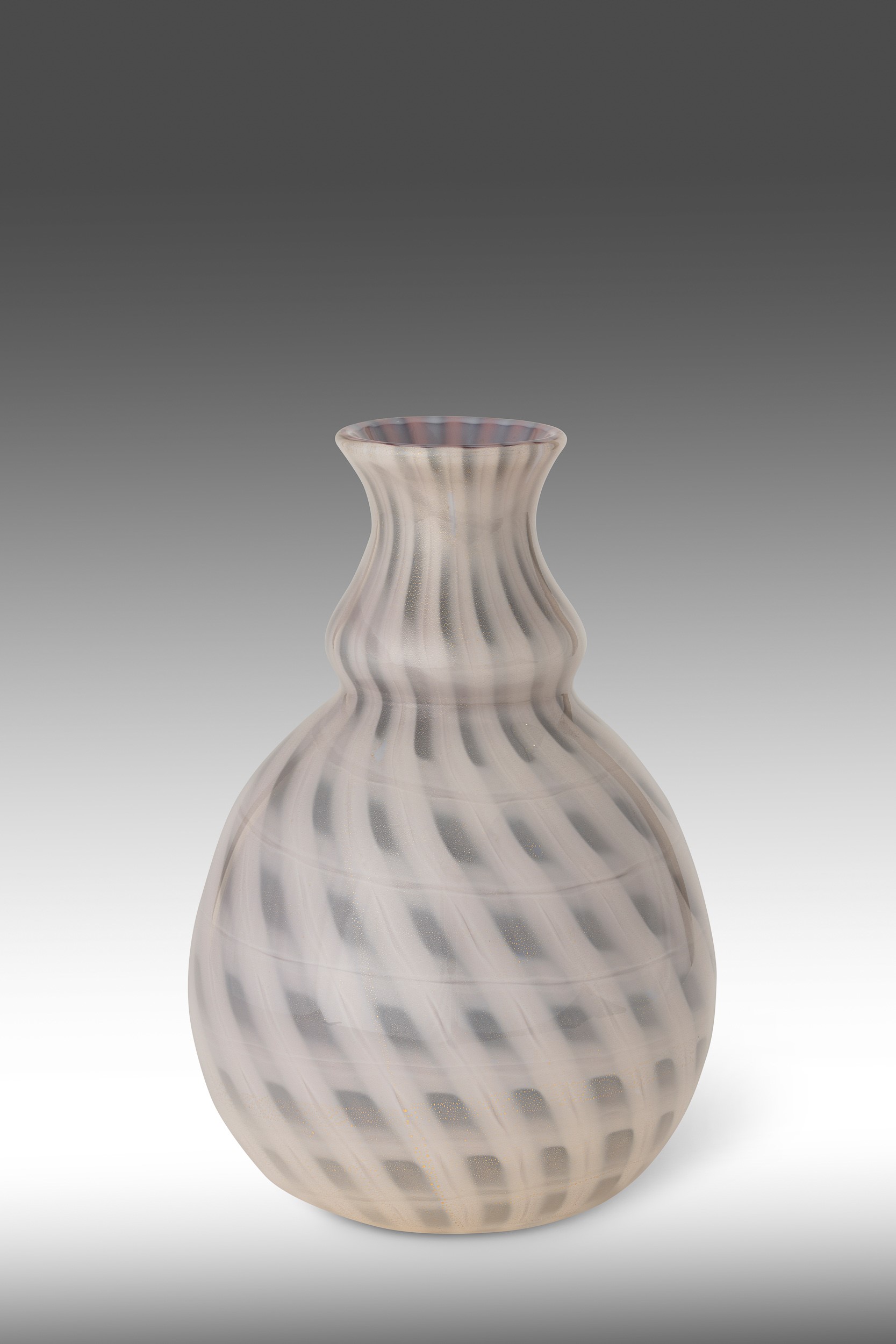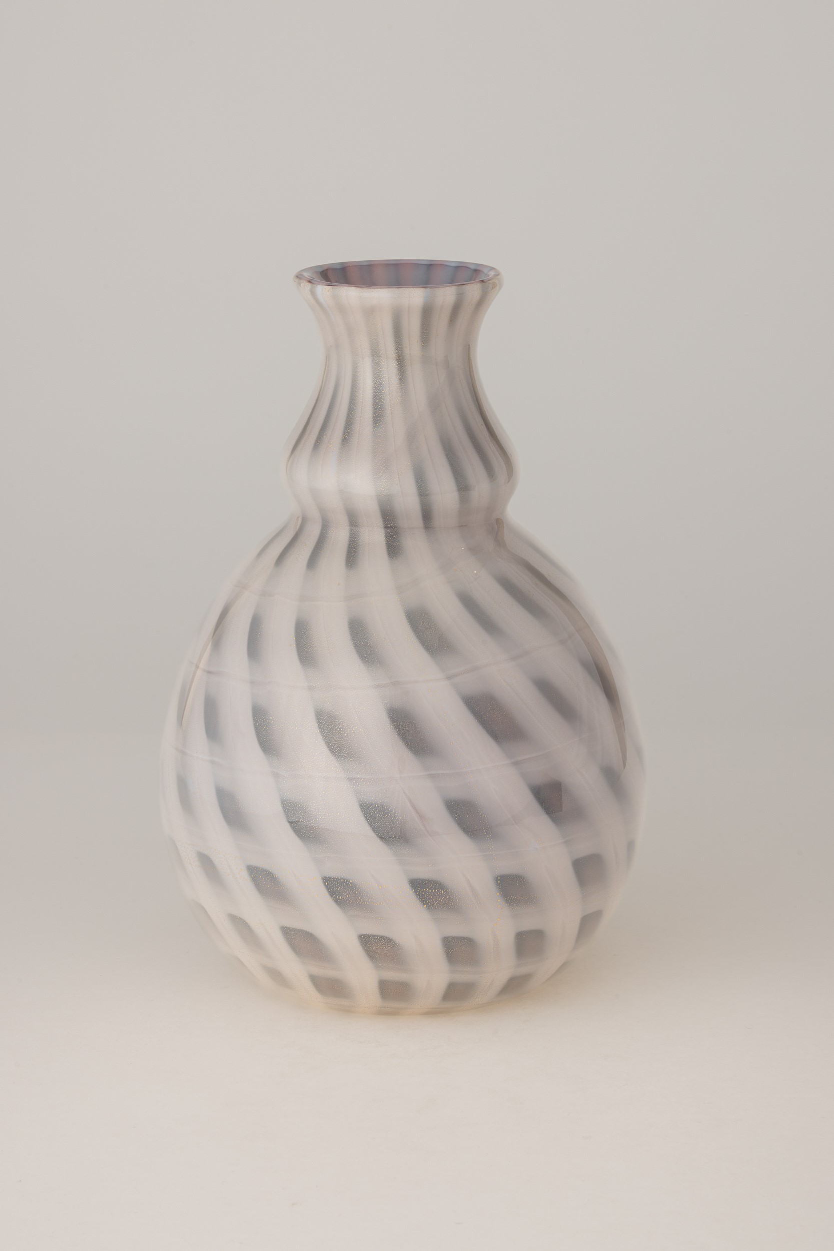 A blown glass vase with a milk glass cane and gold leaf decor. Etched signature Archimede Seguso Murano and old label