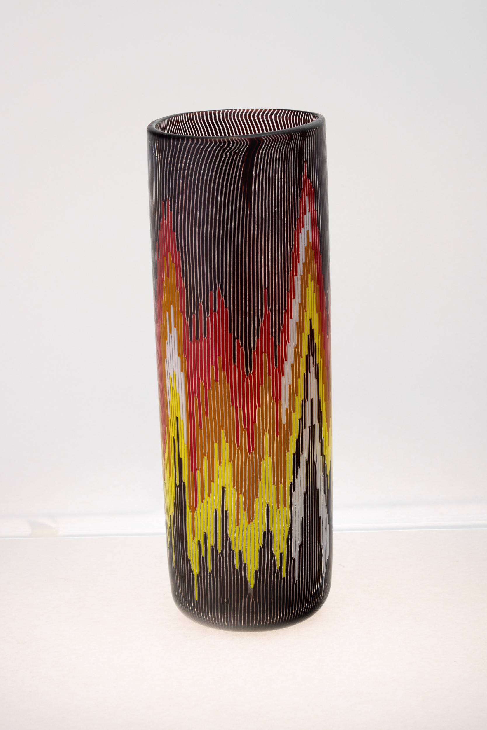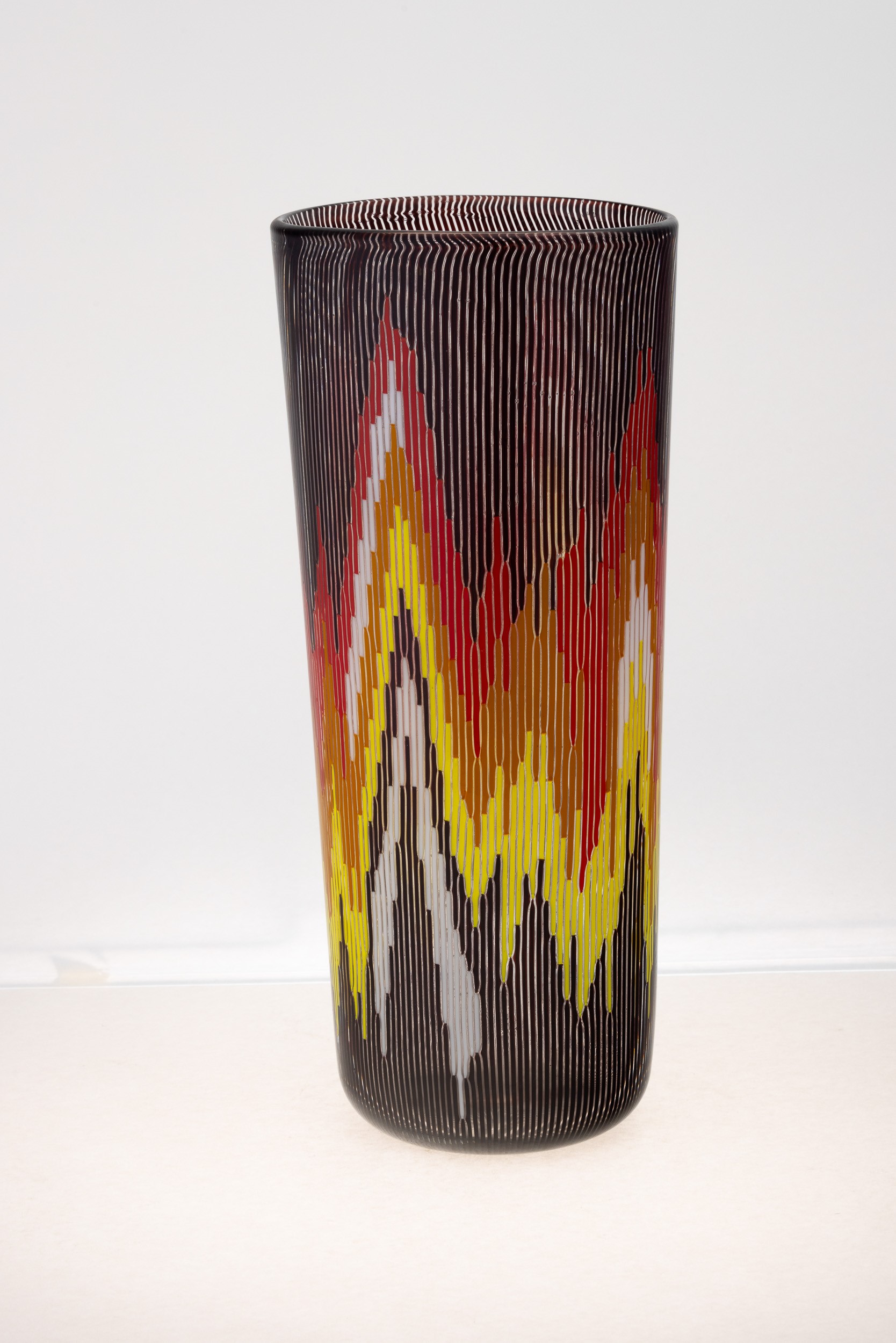 A glass vase from the Fiamme series with a polychrome cane decor. Etched signature Venini 1987 B. del Vicario and old label