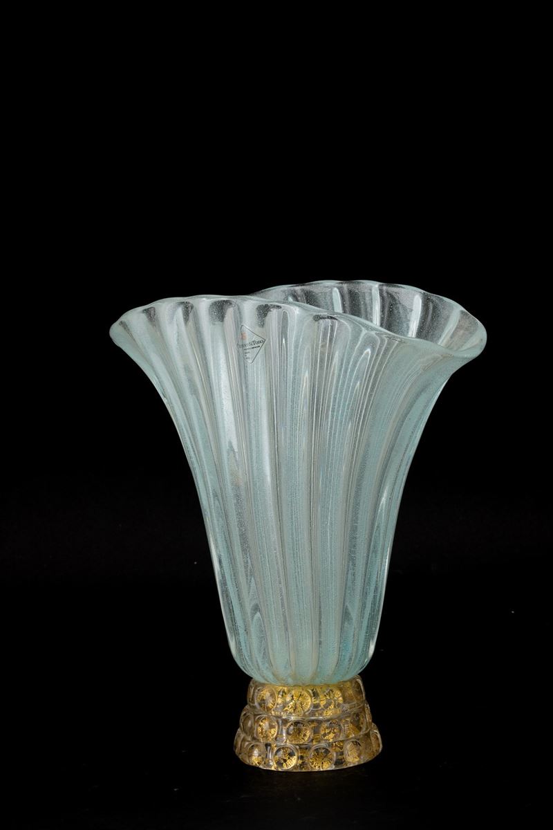A ribbed blown glass vase from the Rigati series with a gold leaf decor. Old label and etched signature on three lines