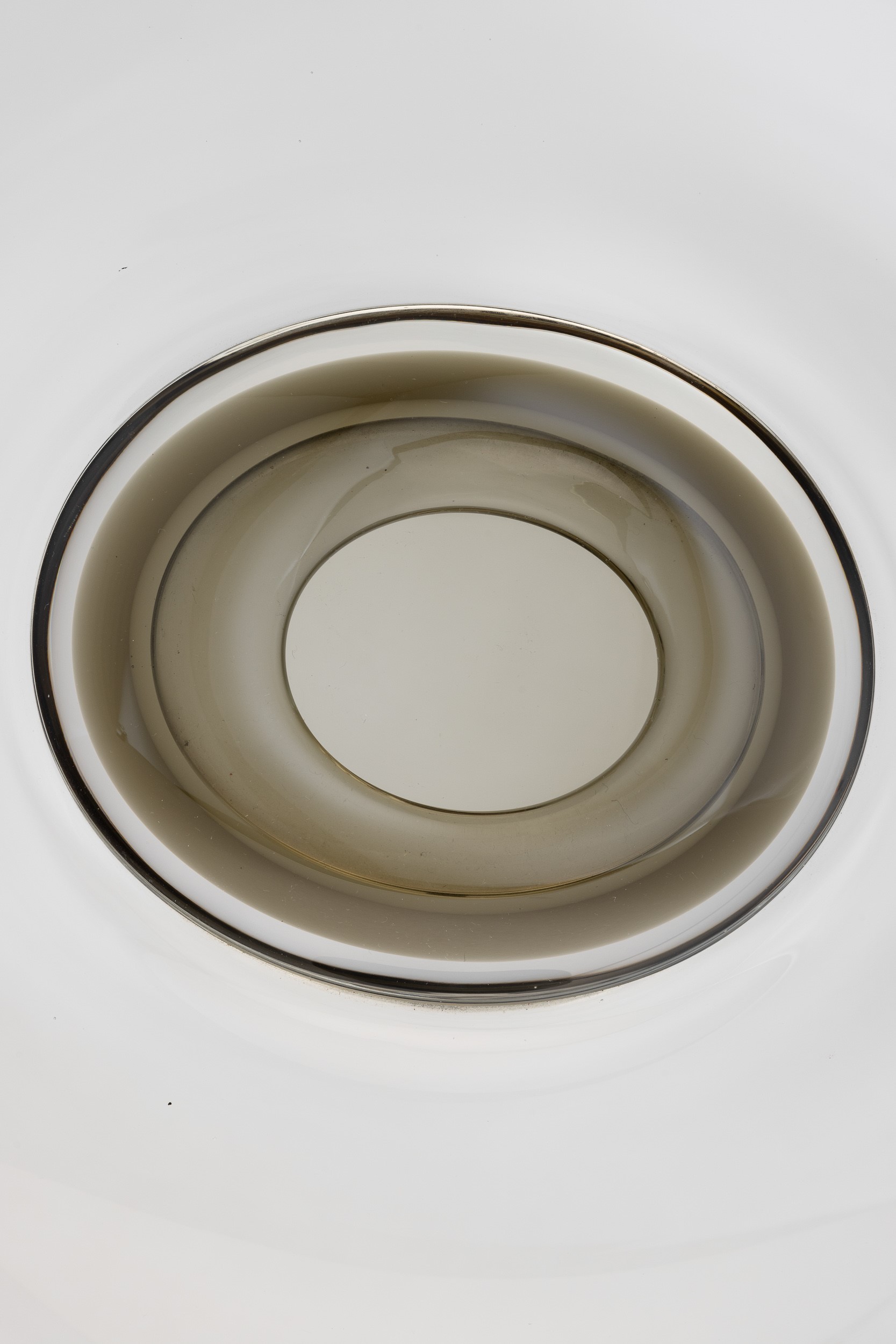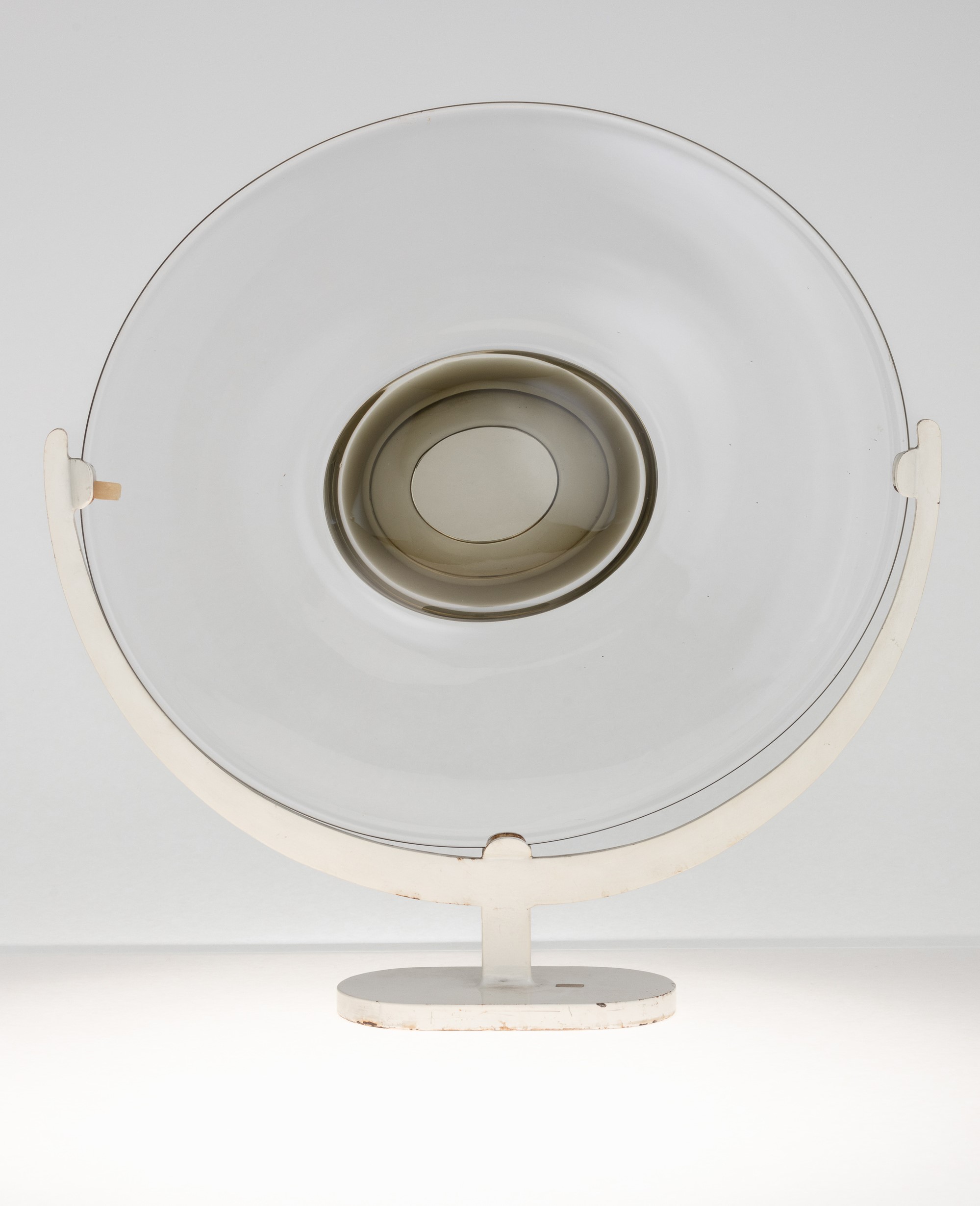 A large clear glass plate from the Costellazione series with a metal base. Gallery label on the base
