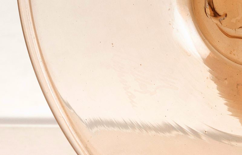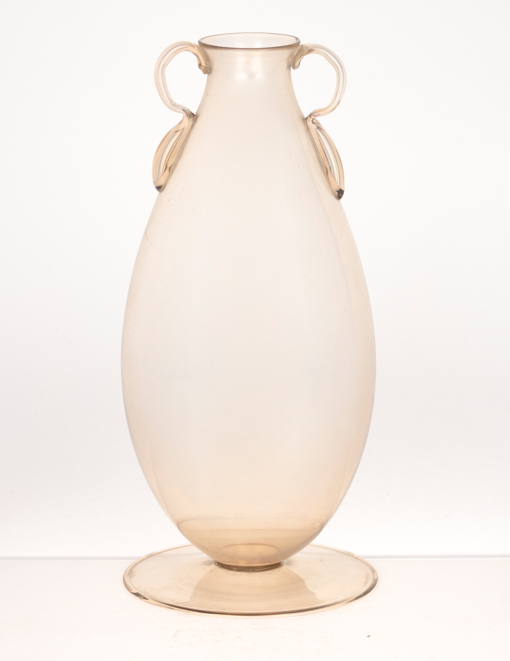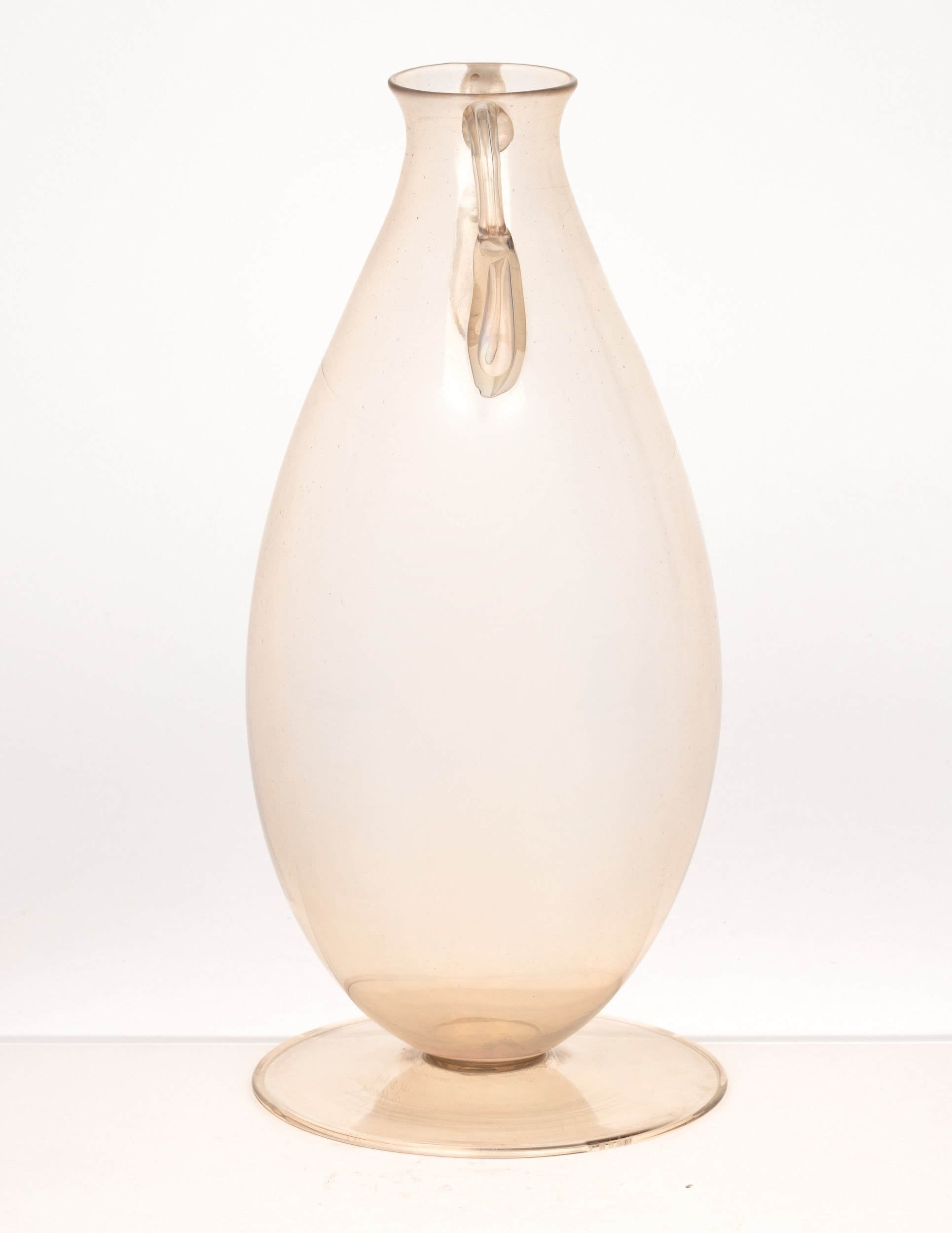 A blown glass vase with an iridised surface. Acid-etched signature MVM Cappellin Murano