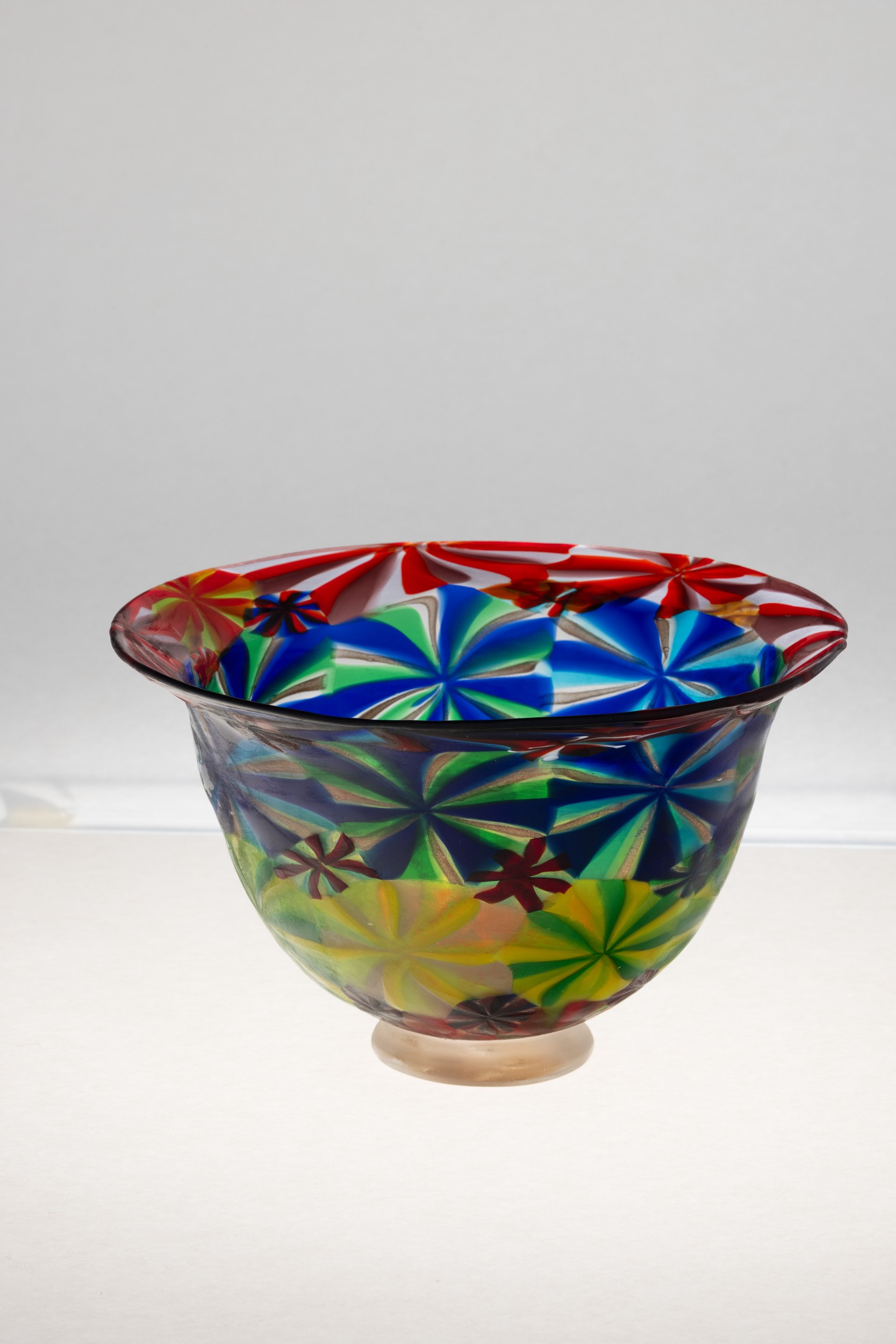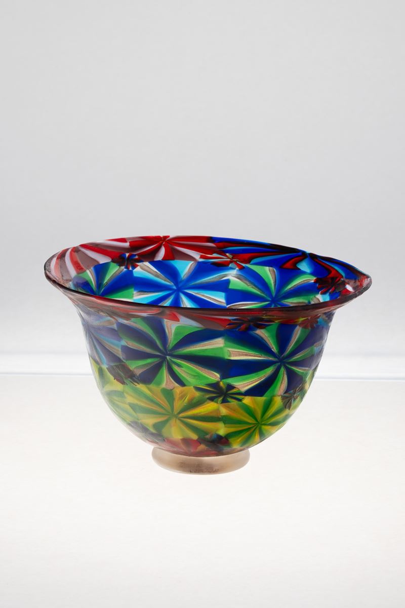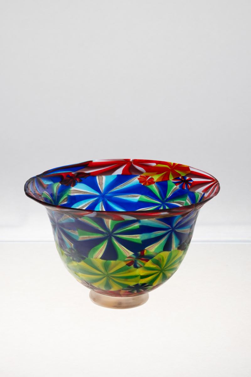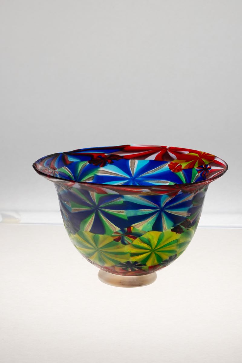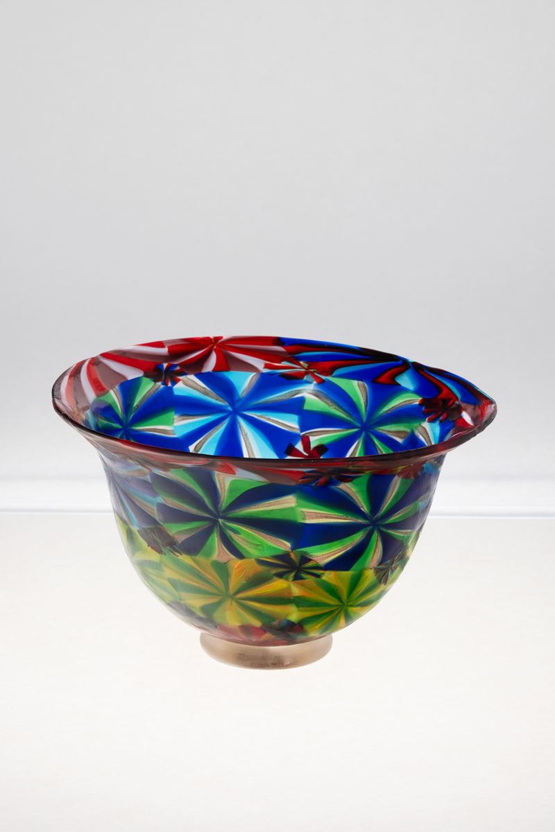A blown glass bowl from the Cattedrale series with a decor of large murrine. Heavy glass base with gold leaf