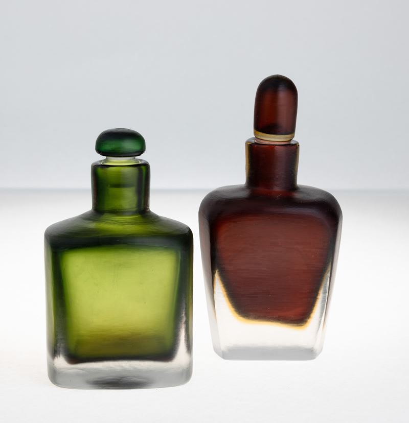 Two sommerso glass bottles from the Incisi series. Acid-etched signature on the green bottle, etched signature Venini Italia on the other one
