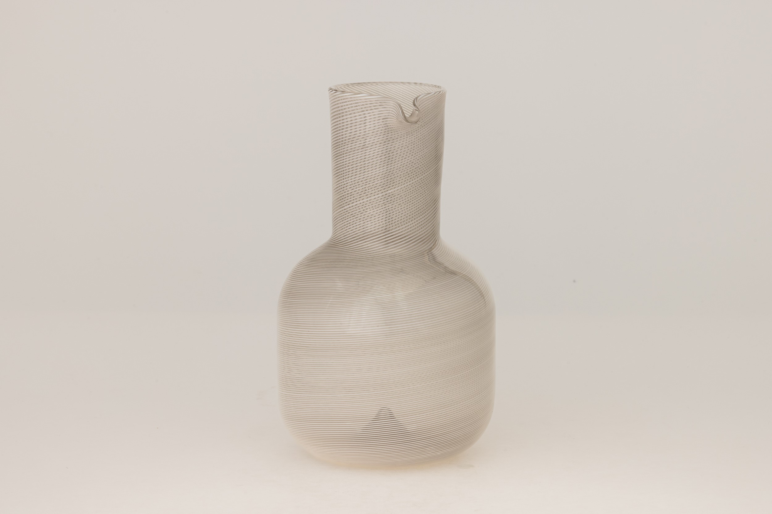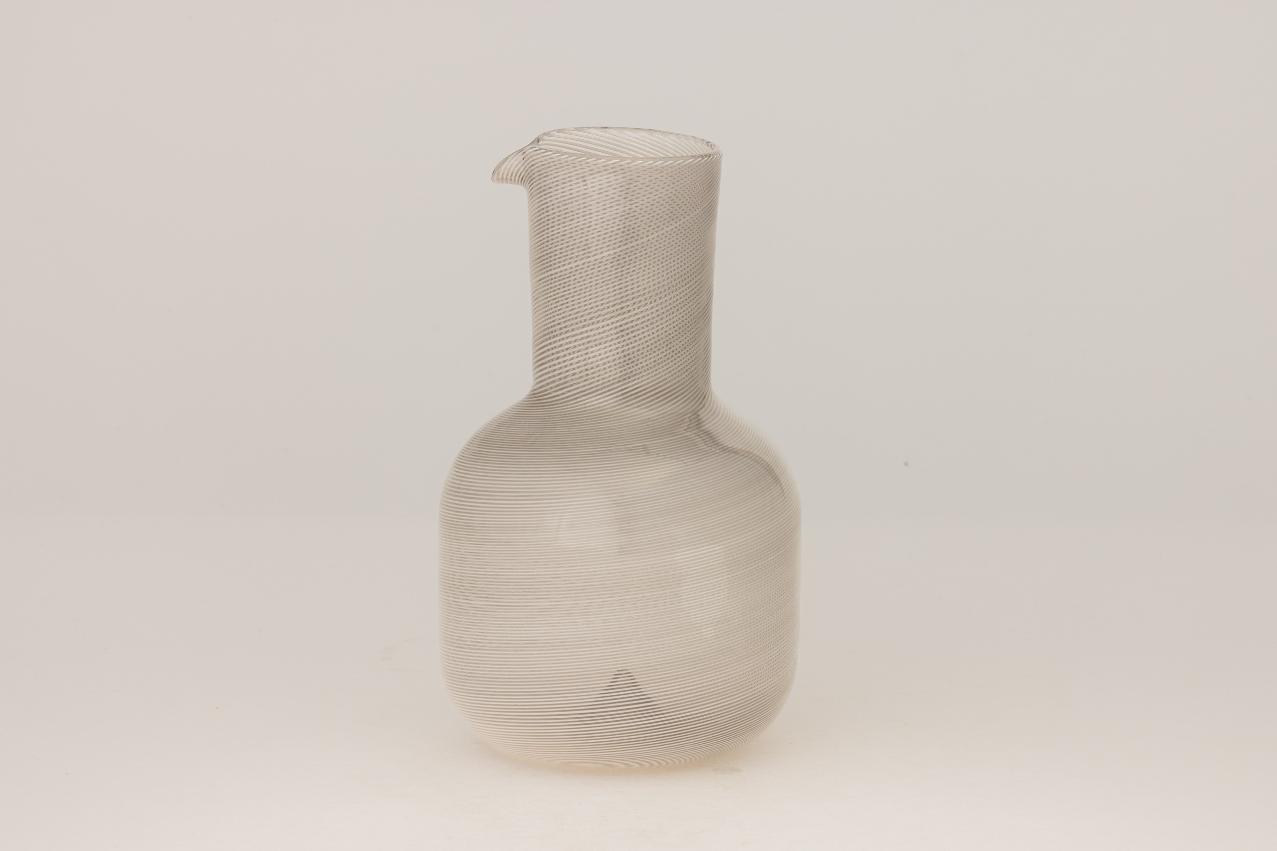 A blown glass pitcher with a filigree decor. Acid-etched signature Venini Italia