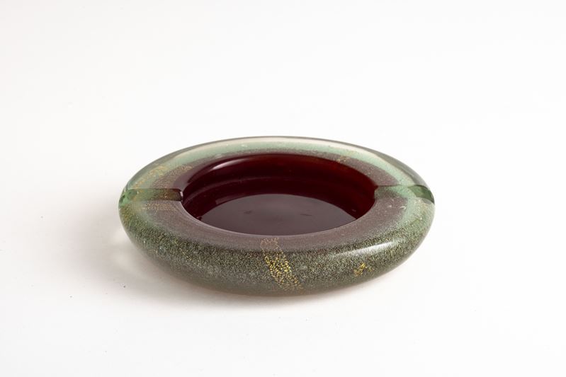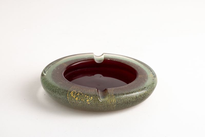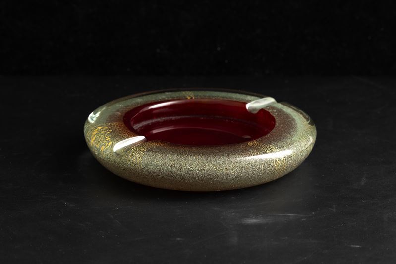 A sommerso glass ashtray from the A Bollicine series with a gold leaf decor. Acid-etched signature Venini Murano