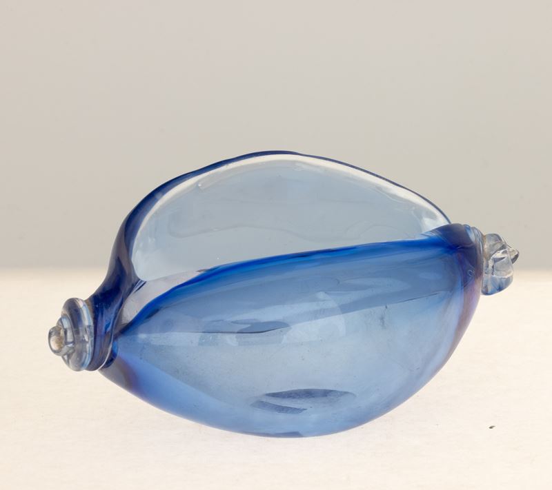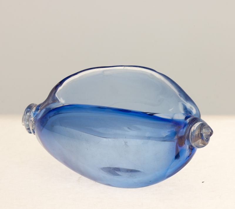 A blown glass seashell ornament with an iridised surface. Acid-etched signature Venini Murano Italia