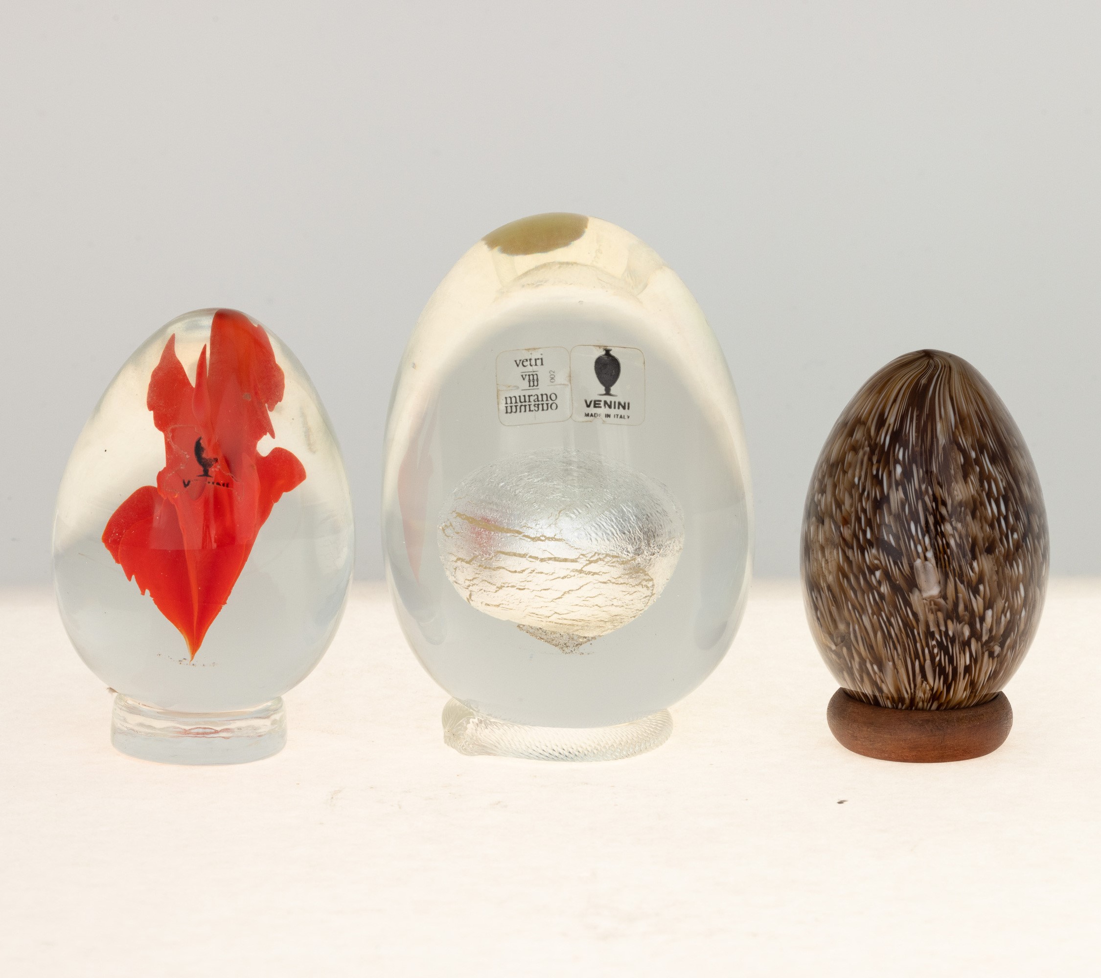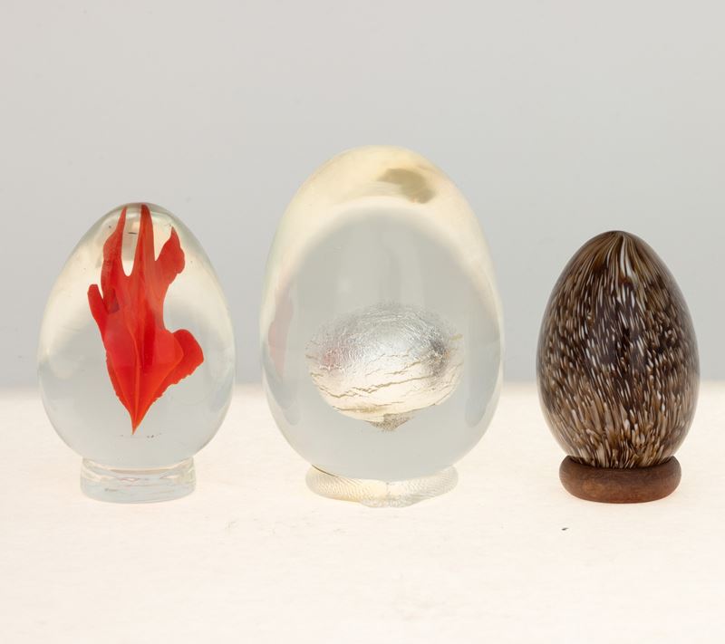 Three heavy glass eggs: one with murrine, the others with sommerso details. Wood and glass bases. Etched dates and signatures and old labels