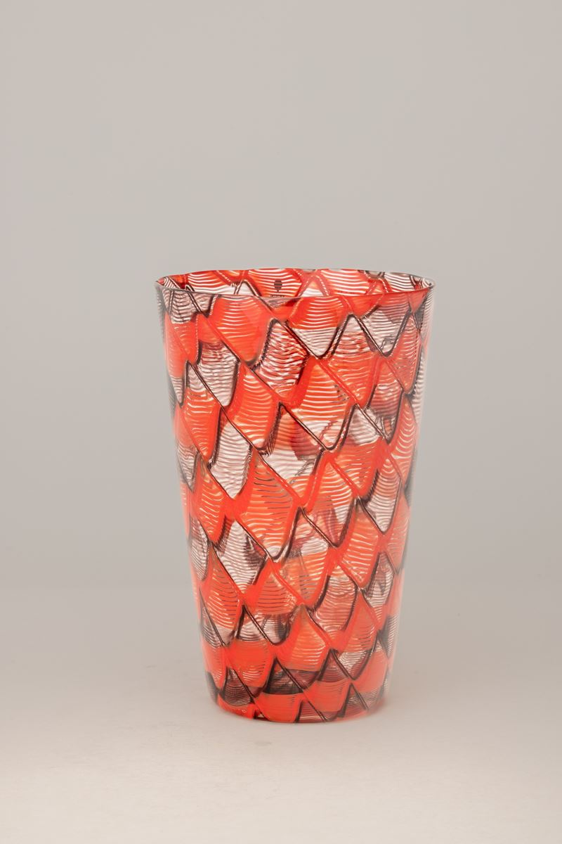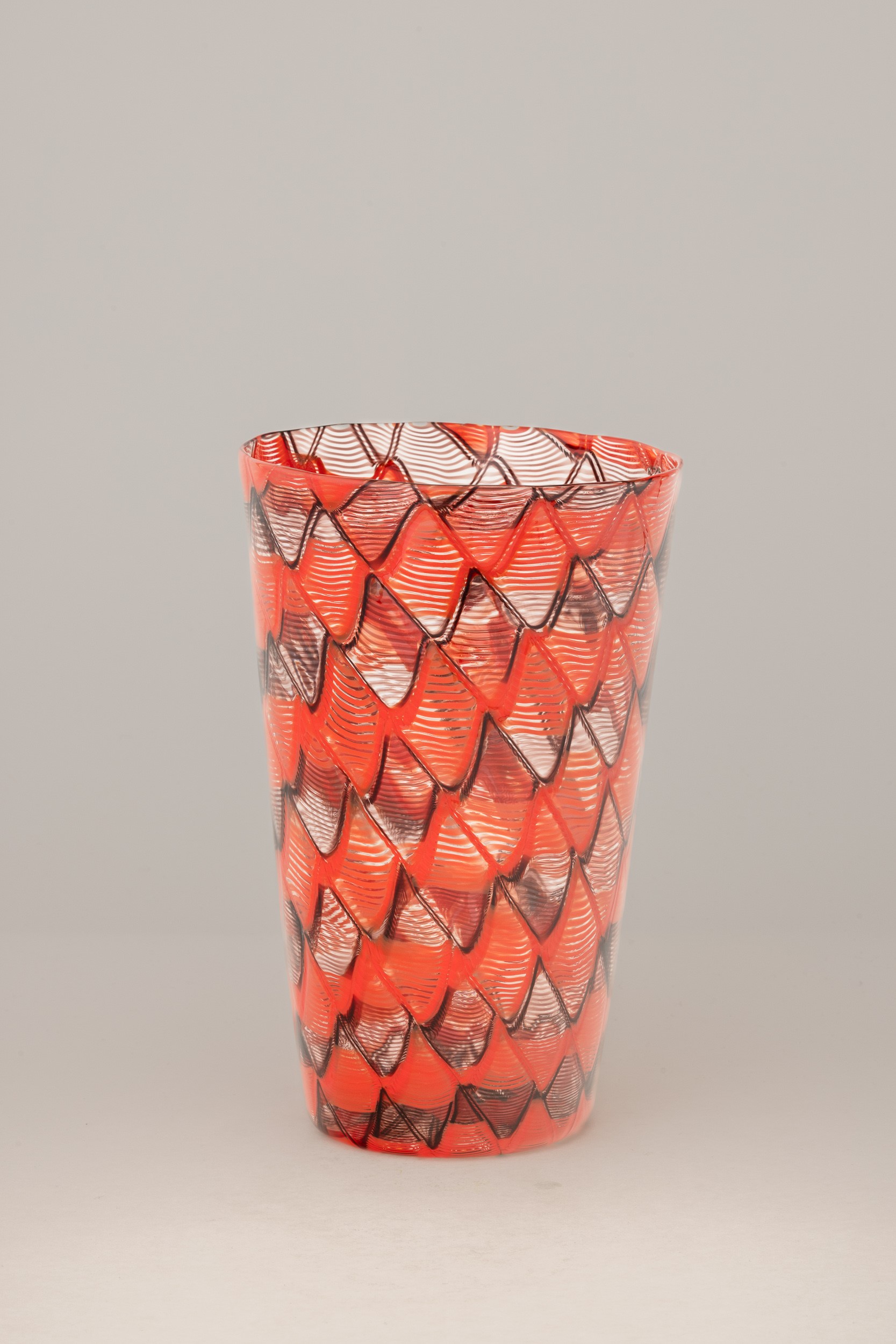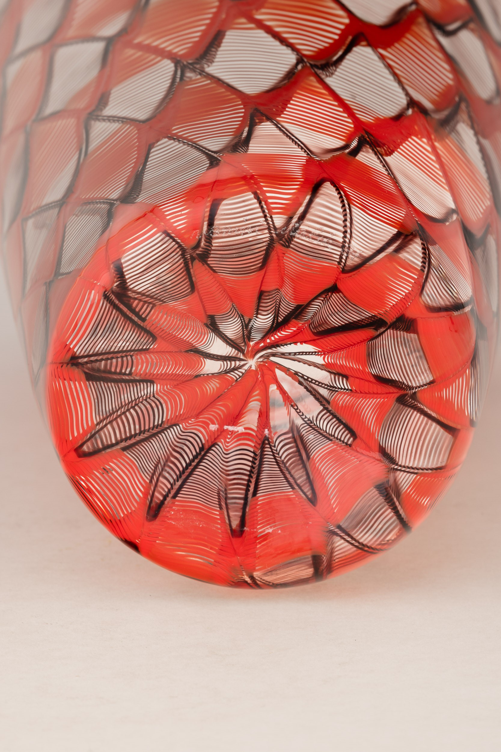 A blown glass vase from the Zanfiriconi series with a tile and cane decor. Etched signature Venini Italia 81 and old label